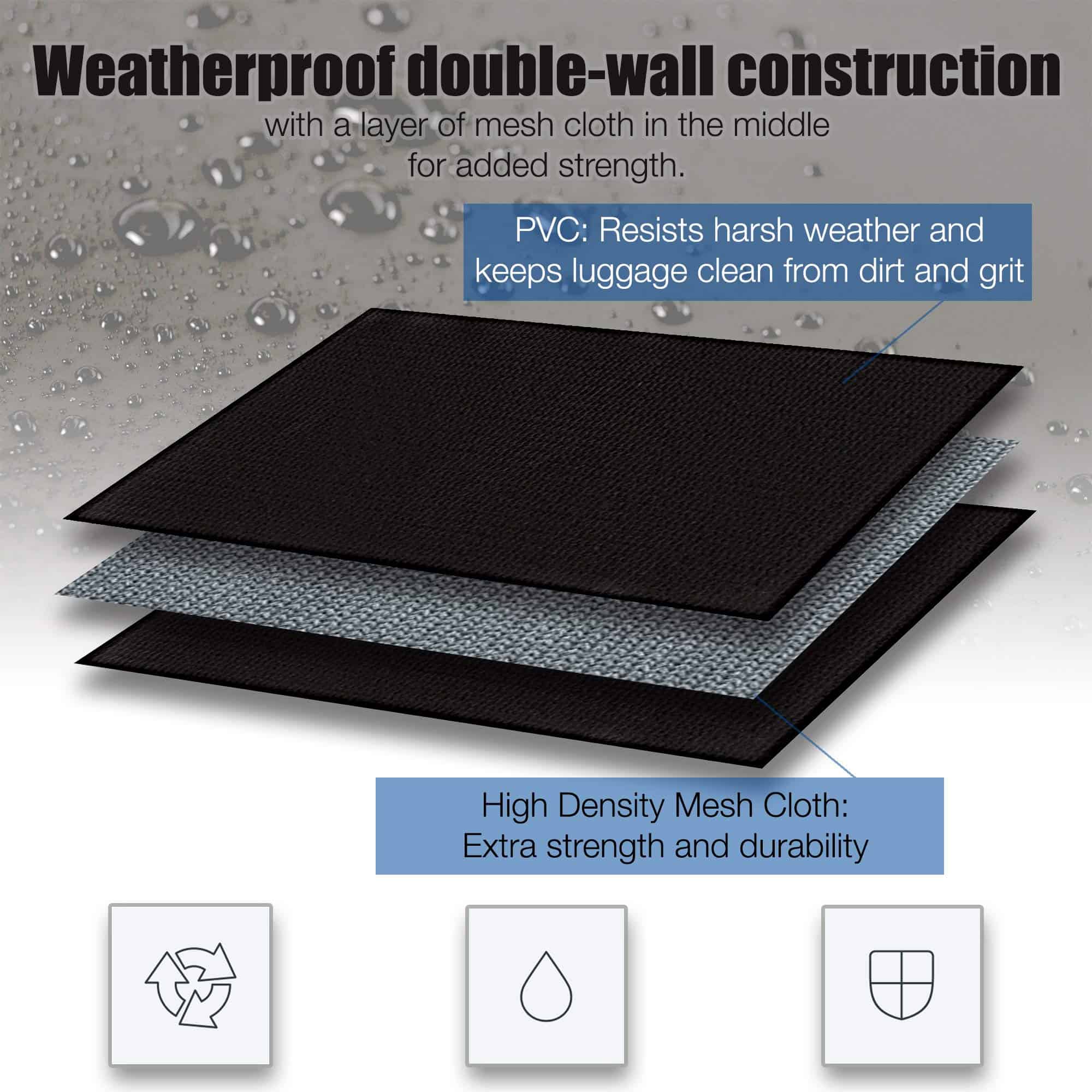 b UNA BOLSA DE TECHO DE COCHE ULTRA DURADERA PARA COMPLEMENTAR ESE VIAJE POR CARRETERA b Durabilidad Destacada Navega bajo la lluvia, viento, sol o suciedad con total confianza. Diseñamos nuestra bolsa impermeable de techo de coche con una cosa principal en mente: manejar lo que sea que la Madre Naturaleza le arroje mientras mantiene tus artículos perfectamente seguros. El secreto detrás de la durabilidad a prueba de intemperie Triple capa de lona que es 100% impermeable y a prueba de polvo. Pero nuestra bolsa de carga para techo va un paso más allá. Mientras que otros dejan entrar agua a través de la cremallera, la nuestra tiene una solapa que se pliega sobre la cremallera y se mantiene en su lugar utilizando un velcro fuerte. Esto significa una resistencia al agua mejorada para darte una mayor tranquilidad. Sorprendentemente Espaciosa ¿Buscas espacio de carga adicional para todos tus elementos esenciales de camping o viaje por carretera Te tenemos cubierto. Instala esta bolsa de techo en la parte superior de tu coche y obtén 15 pies cúbicos de espacio adicional en poco tiempo. ¿Cuánto puedes almacenar dentro de la bolsa Piensa en más de 5 maletas de tamaño mediano de cosas. Y configurarla es fácil. Cada bolsa de techo viene con correas reforzadas con hebillas resistentes. Simplemente sigue la guía simple e instala de forma segura tu portaequipajes en el techo de casi cualquier coche. Aquí hay más razones para amar esta bolsa de techo: – Se pliega compactamente para almacenamiento amigable con el espacio cuando no está en uso. – Mide 44″ (L) X 34″ (W) X 17″ (H) para adaptarse a la mayoría de los coches. – Tiene una cubierta suave que se flexiona para almacenar artículos de formas extrañas. – Sencillo de mantener; solo necesita una limpieza rápida. b ¡Añade espacio de carga impermeable con nuestra bolsa de rack de techo y obtén un sin igual ! b