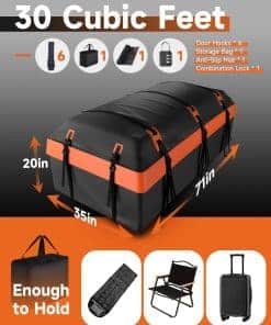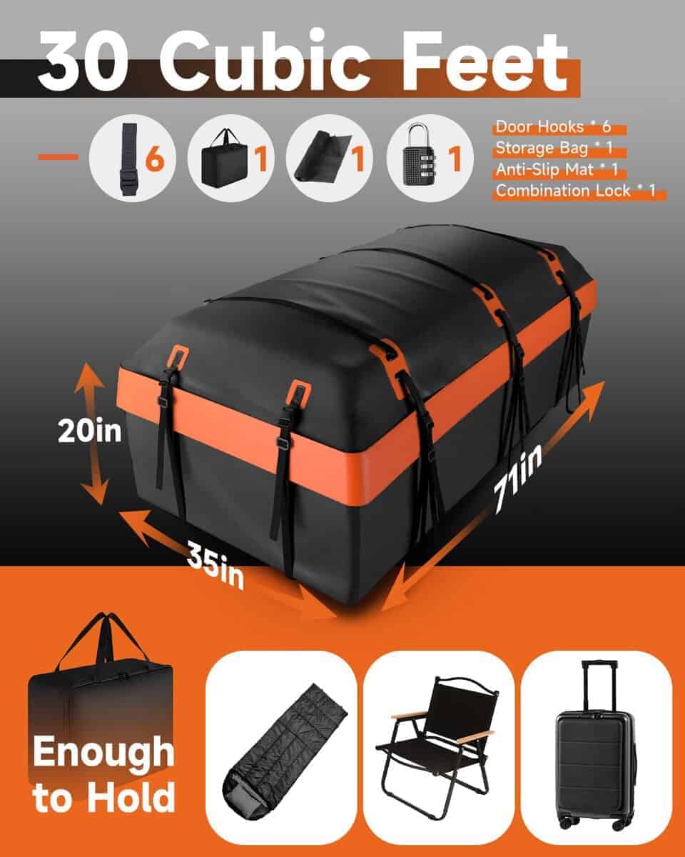 1. Espacio de Almacenamiento Extra Grande: Con dimensiones de 71 x 35 x 20 pulgadas. Esta bolsa para el techo del coche ofrece 30 pies cúbicos de espacio de almacenamiento, para guardar fácilmente el equipaje de una familia de 5-6, cubriendo todas sus necesidades de almacenamiento de aventuras al aire libre.