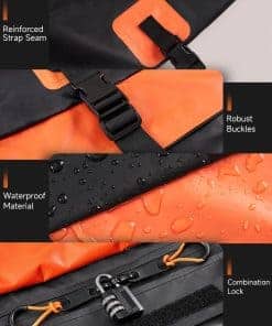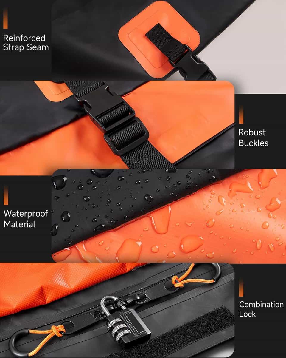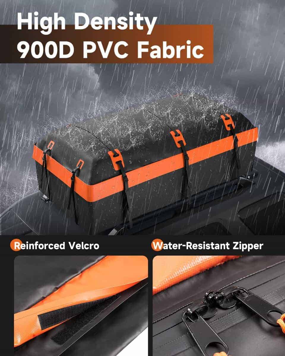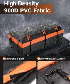 2. Resistente a los Desgarros: La bolsa de carga para el techo del coche fue diseñada para durar con tela de PVC anti-abrasión de alta resistencia de 900D que puede soportar condiciones climáticas severas y un manejo brusco. Las costuras soldadas triplemente reforzadas brindan resistencia adicional para prevenir desgarros, haciéndola ultra duradera y confiable.