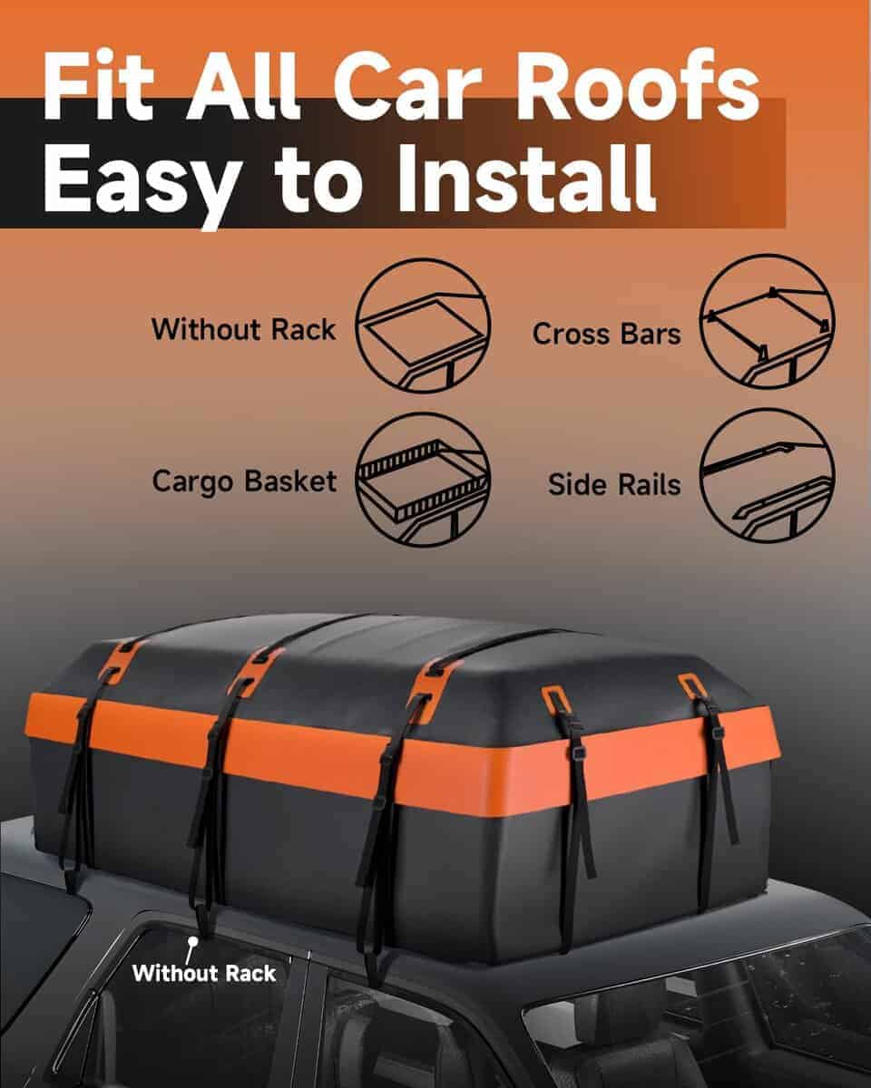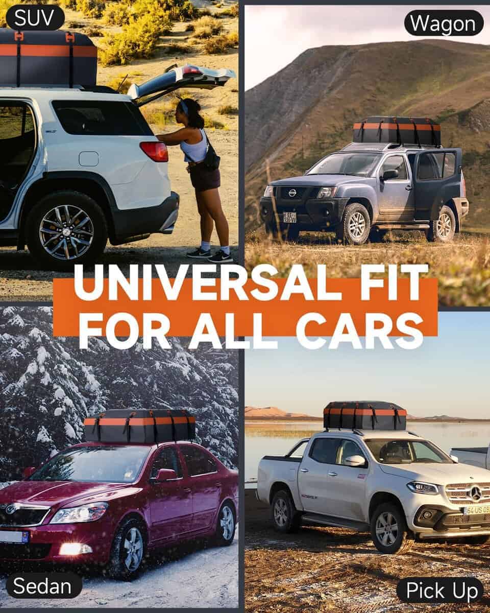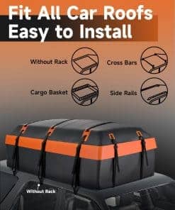 5. Apto Para la Mayoría de los Vehículos: Con ganchos adicionales para puertas, esta bolsa portaequipaje para el techo del coche es versátil y puede ser utilizada con casi cualquier coche o SUV, independientemente de si tiene o no un portaequipajes en el techo.