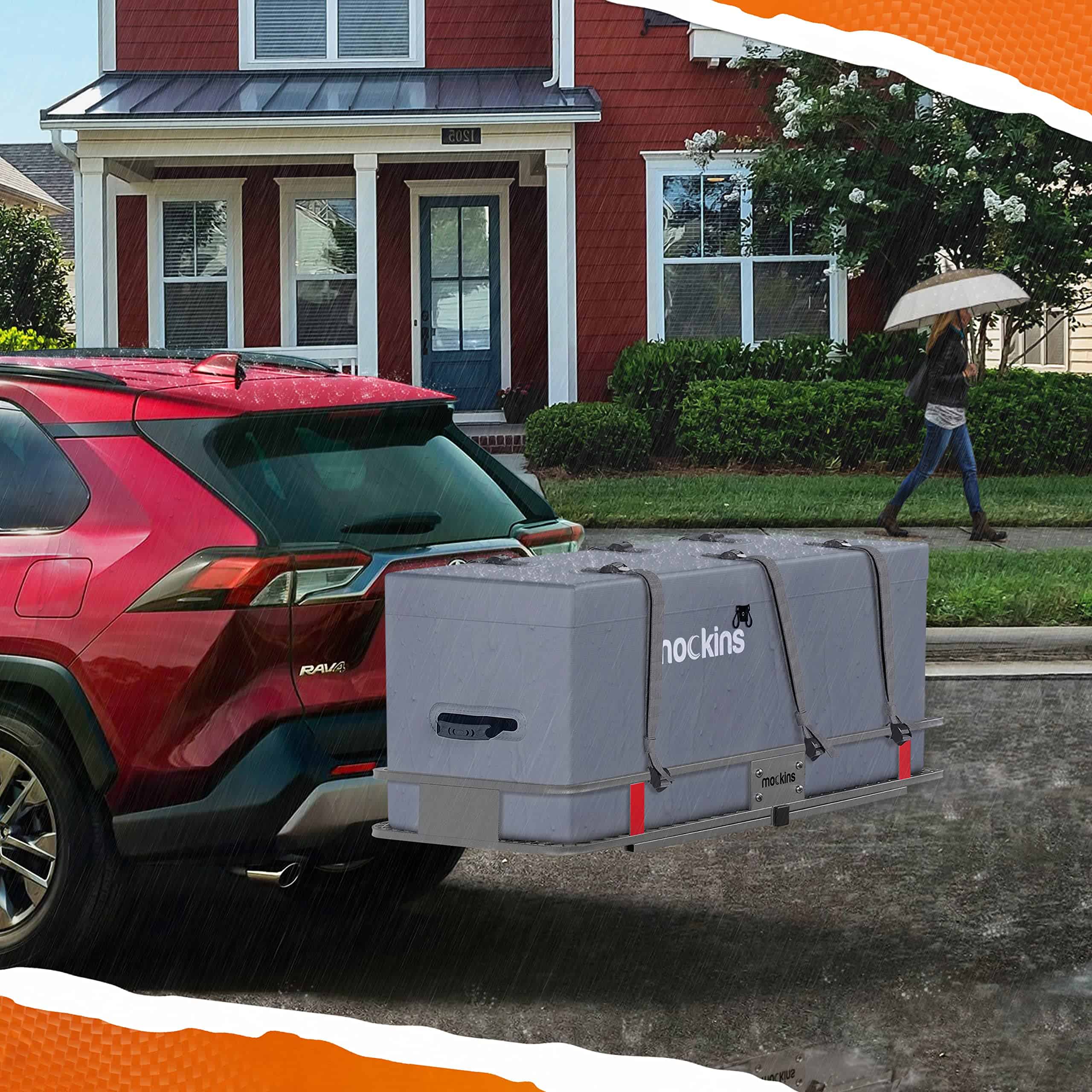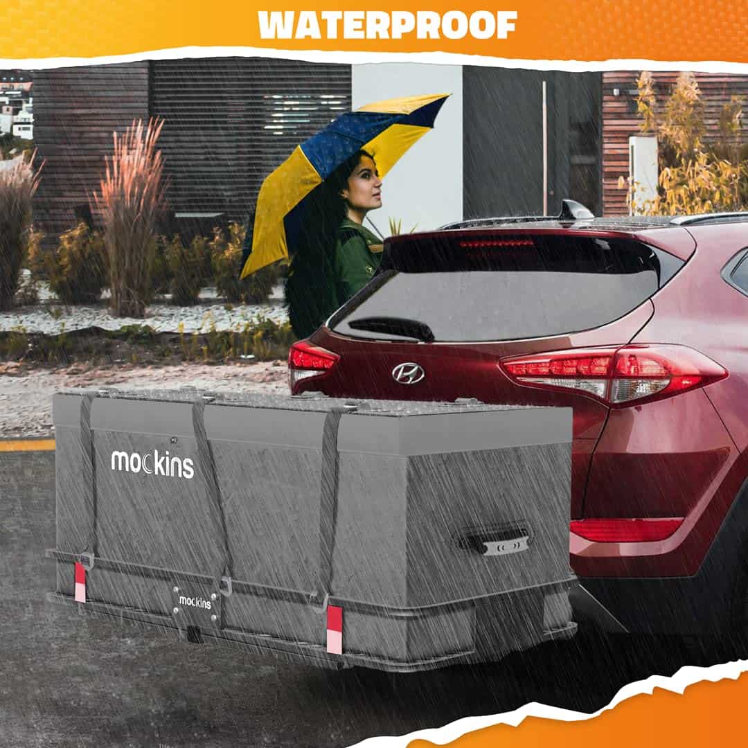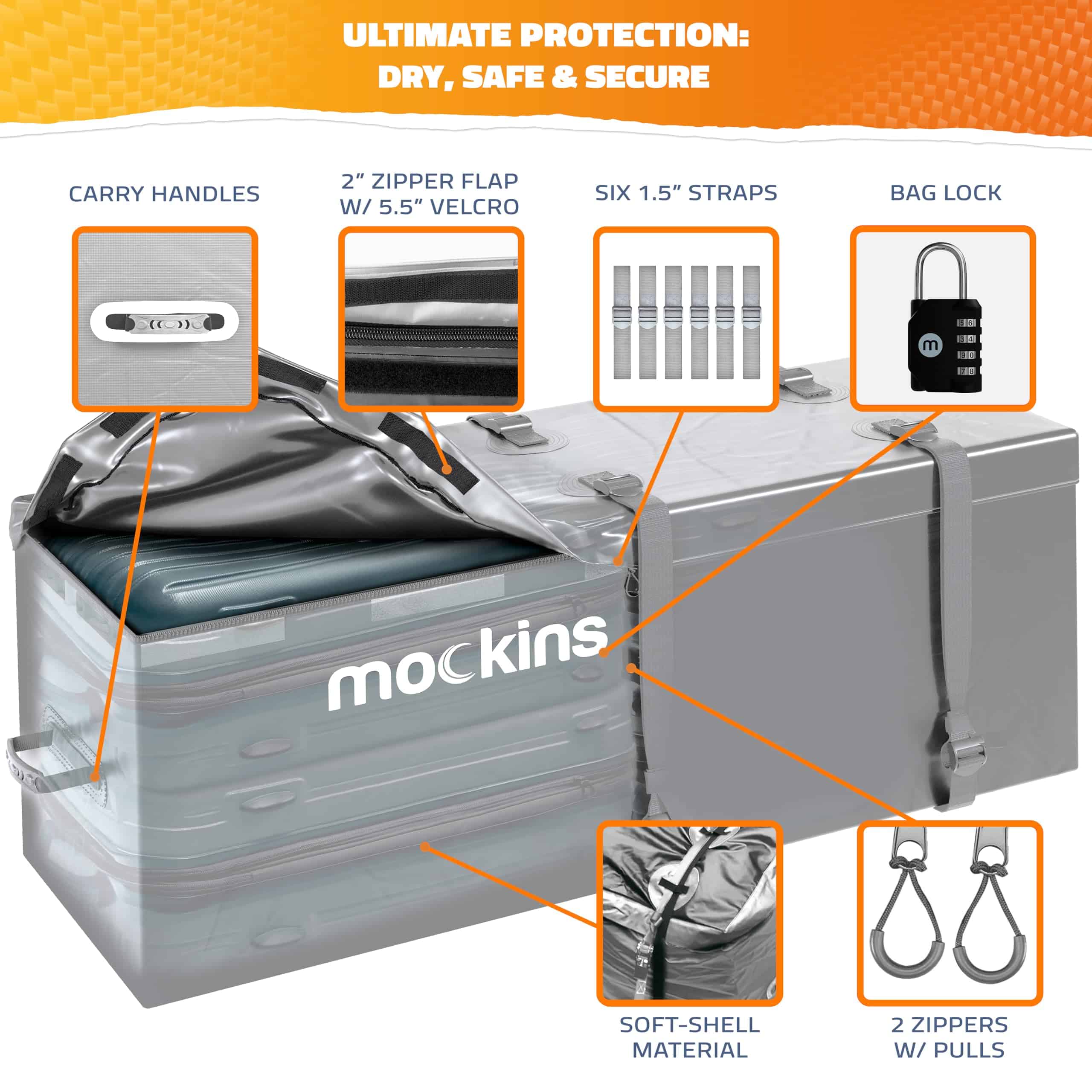 4. BOLSA DE CARGA PARA AUTO Y CAMIÓN FÁCIL DE USAR: La Bolsa de Carga para Automóvil Mockins para cama de camión y portaequipajes de enganche cuenta con cierres duraderos envolventes para cargar y descargar sin esfuerzo sus pertenencias. Los asas laterales de la bolsa para vehículos hacen que sea fácil levantar y colocar la bolsa de carga de enganche para automóvil. La instalación es sencilla y, cuando no se usa, la bolsa de almacenamiento impermeable para cama de camión se dobla de forma compacta para guardarla de forma segura en el estuche de transporte incluido hasta su próxima aventura! ¡Esté listo para la carretera con nuestras bolsas de almacenamiento impermeables extra grandes.