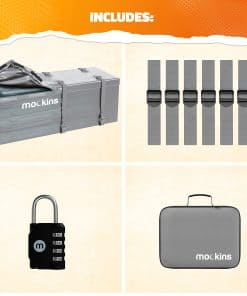 5. EL CUIDADO AL CLIENTE VA PRIMERO: Mockins respalda nuestras bolsas de carga premium para almacenamiento en cama de camión tanto como valoramos a nuestros clientes. Por eso ofrecemos una garantía limitada de 10 años en este paquete de bolsa de carga impermeable para cama de camión, completo con correas con hebilla de alta resistencia, un candado de combinación y estuche de transporte. Si tiene problemas o inquietudes sobre su bolsa de carga de auto y camión, nuestro equipo estará encantado de ayudar! Transporte su equipo con confianza usando el Juego de Almacenamiento Impermeable para Bolsas de Carga Gris de Mockins.