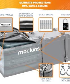 2. BOLSA DE CARGA IMPERMEABLE LISTA PARA TODO CLIMA: ¿Busca una bolsa de equipaje impermeable para cama de camión o portaequipajes de enganche para automóvil? Esta bolsa de carga impermeable está hecha de vinilo resistente a la abrasión para resistir los elementos. Cierres robustos protegidos debajo de una solapa de 2″ con tiras de Velcro de 5.5″ ayudan a sellar la humedad, manteniendo secos los contenidos de su bolsa de carga para enganche. Las costuras reforzadas ayudan a resistir rasgaduras, convirtiendo el Almacenamiento Impermeable de Mockins para cama de camión y cesta de carga en un imprescindible para cada viaje por carretera.