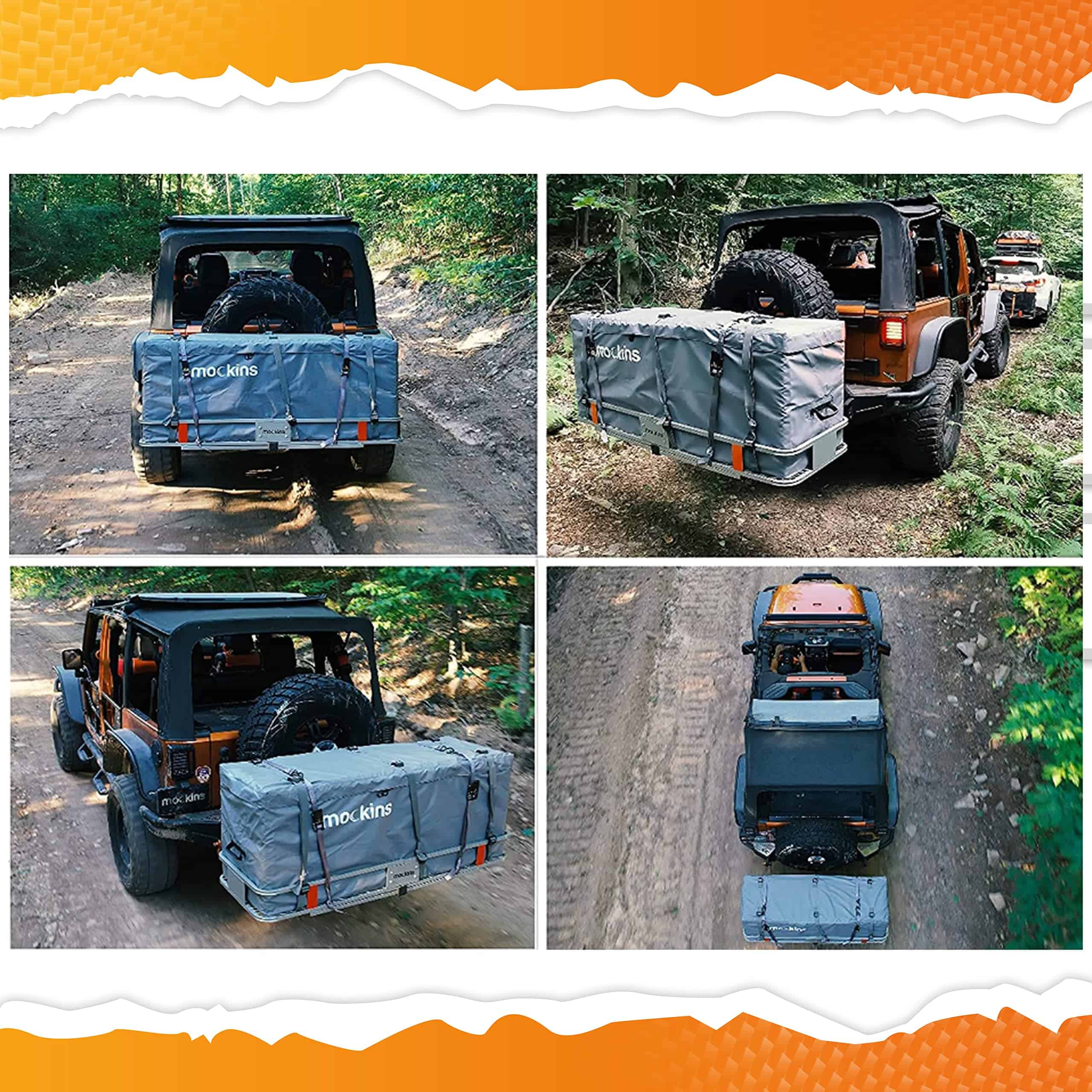 3. KIT DE TRANSPORTADOR DE BOLSA TODO EN UNO: Asegure sin esfuerzo su equipo para el camino con las Bolsas de Carga Mockins. Esta bolsa de carga para canasta de portaequipajes de enganche viene con 6 prácticas correas con hebilla para mantener firmemente en su lugar sus cargas, evitando que se desplacen mientras están cargadas en un portaequipajes montado en enganche. Para una protección adicional, el juego de almacenamiento impermeable para cama de camión y enganche para automóvil también incluye un candado de combinación para disuadir robos durante los viajes. Disfrute de un transporte sin complicaciones con las soluciones de Bolsa de Carga de Mockins.