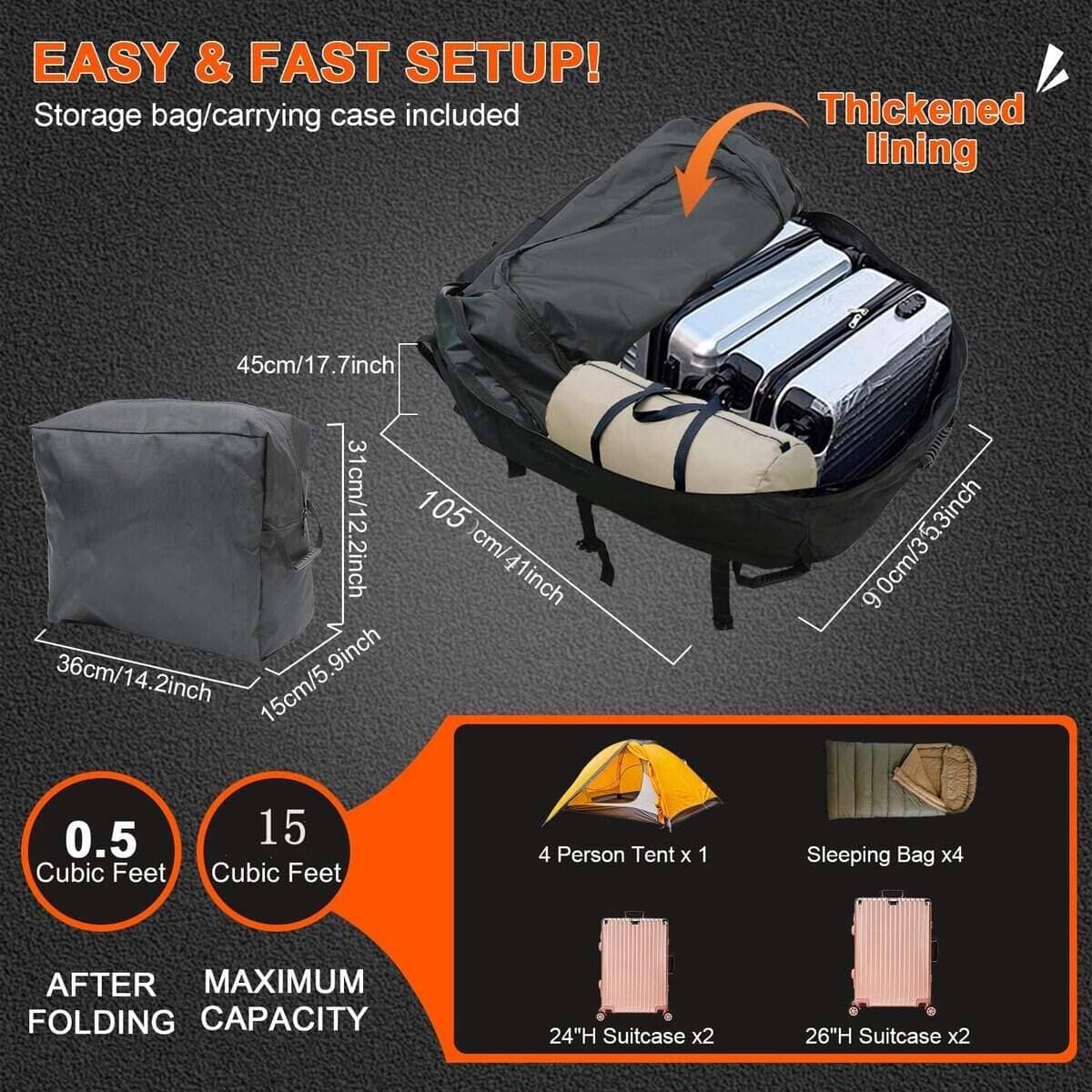 Esta Bolsa de Carga para Techo de Coche es la solución perfecta para añadir espacio de almacenamiento adicional a tu vehículo. Con una capacidad de 15 pies cúbicos, podrás transportar fácilmente todo lo que necesitas en tus viajes sin preocuparte por el espacio limitado en el interior del coche. Fabricada con materiales de alta calidad, como tela Oxford resistente al agua y un revestimiento interior impermeable, esta bolsa de carga para techo de coche garantiza que tus pertenencias permanezcan secas y protegidas durante tus desplazamientos. Su instalación es rápida y sencilla, ya que se puede sujetar fácilmente al portaequipajes del vehículo en cuestión de minutos. Además, su diseño universal la hace compatible con cualquier tipo de coche, independientemente de si tiene portaequipajes o no. Aprovecha al máximo el espacio de almacenamiento de tu coche con esta Bolsa de Carga para Techo de Coche de Alta Resistencia.