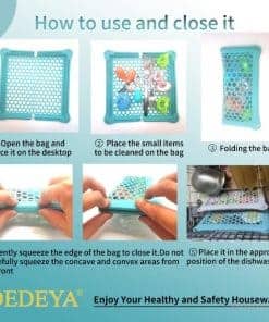 3. Cómo cerrarlo: A. Abre la red y colócala en la mesa. B. Coloca los artículos pequeños a limpiar en la bolsa. C. Dobla y cierra la bolsa. D. Presiona suavemente el borde de la bolsa para cerrarla. Si aún no estás seguro de cómo cerrarla, por favor mira la demostración en video en la plataforma.