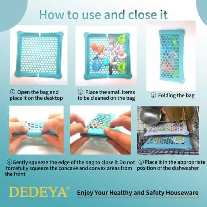 1. Dobla y cierra la red para almacenar y sostener artículos pequeños en el lavavajillas, evitando que sean arrojados o desechados durante el proceso de limpieza. Es conveniente almacenar artículos pequeños como chupetes y biberones de bebé para limpiarlos, evitando que sean arrojados o perdidos durante el proceso de limpieza.