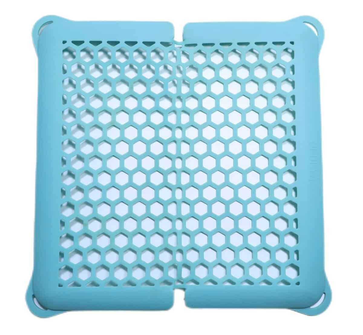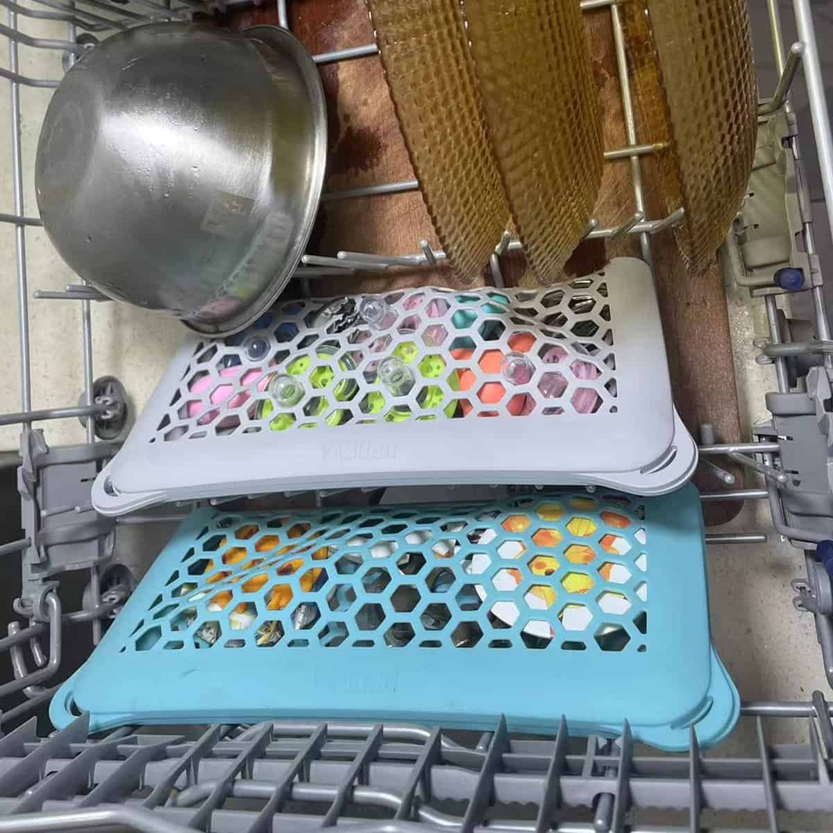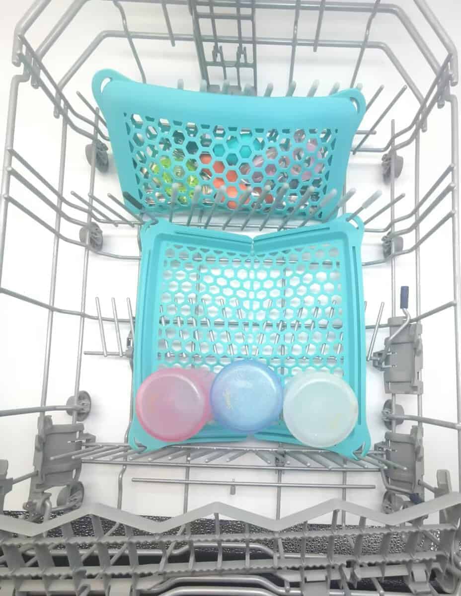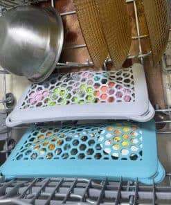2. Puedes abrir la red y colgar los cuatro agujeros en las esquinas en el soporte del lavavajillas para formar una red y mantener los artículos más pequeños o ligeros fijados durante el proceso de limpieza. Manten las partes pequeñas de biberones, bombas de lactancia, chupetes y más seguros para que no sean arrojados en el lavavajillas.