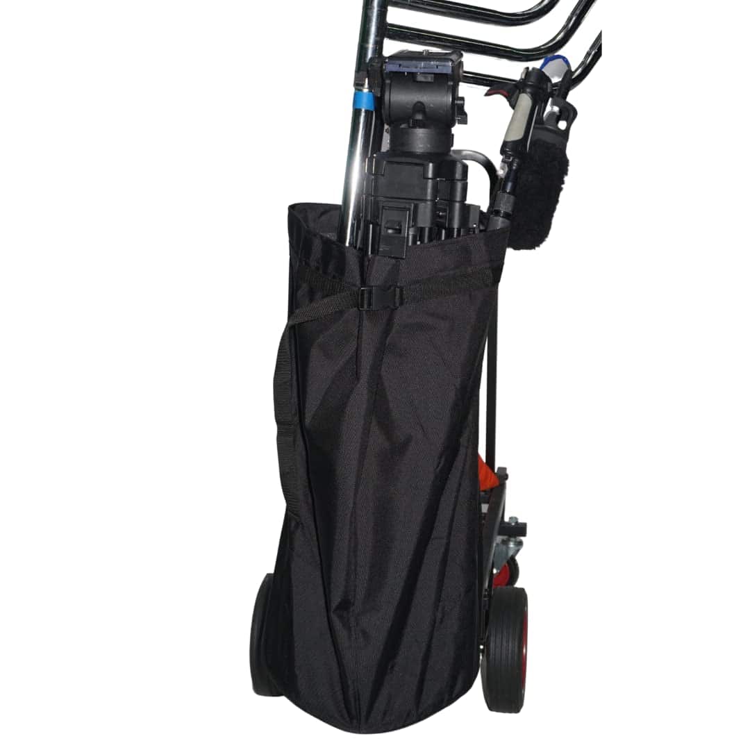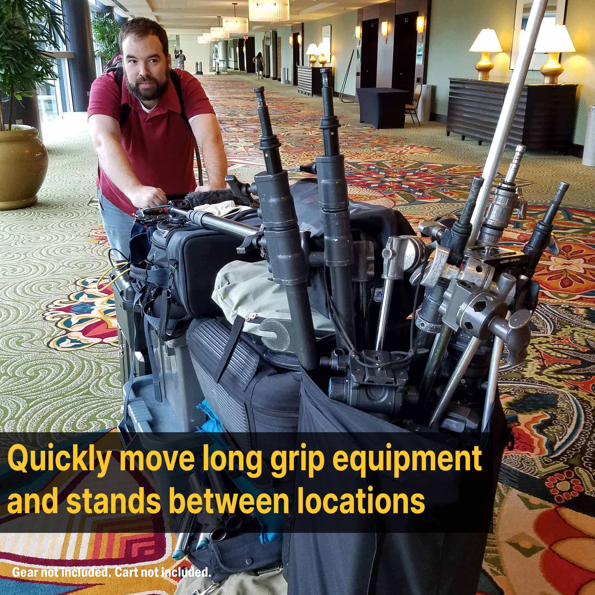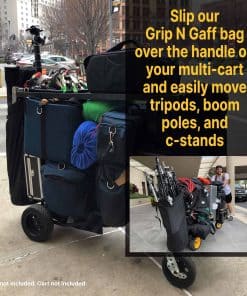 1. ESENCIAL PARA TRABAJOS EN LOCACIONES: Simplemente desliza nuestra bolsa GripnGaff sobre el mango de tu carretilla RocknRoller R6G, R6RT, Gator Frameworks All-Terrain Cart, o JamStands JSKC90 Karma Pro Multicarts y mueve fácilmente c-stands, trípodes, soportes de luz, pértigas de boom y otros equipos largos y torpes dentro y fuera de edificios.