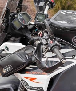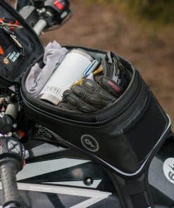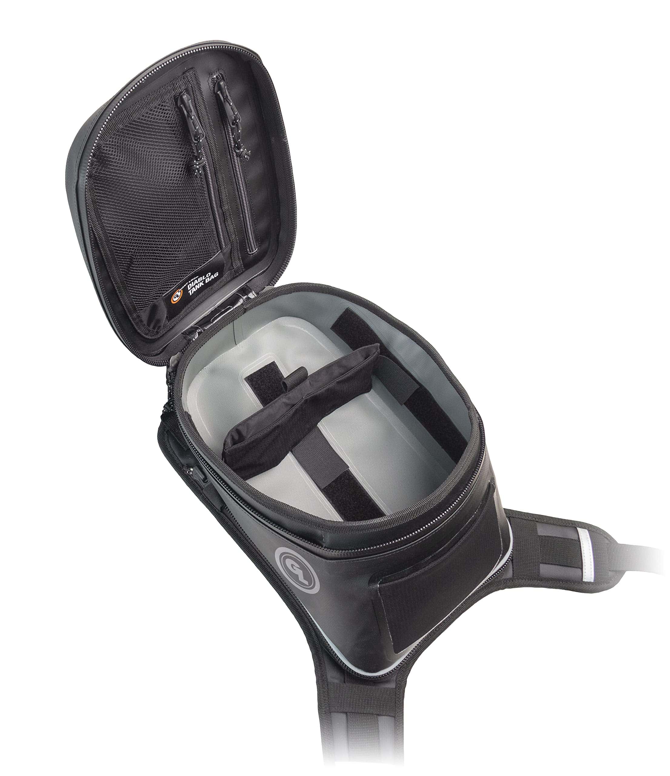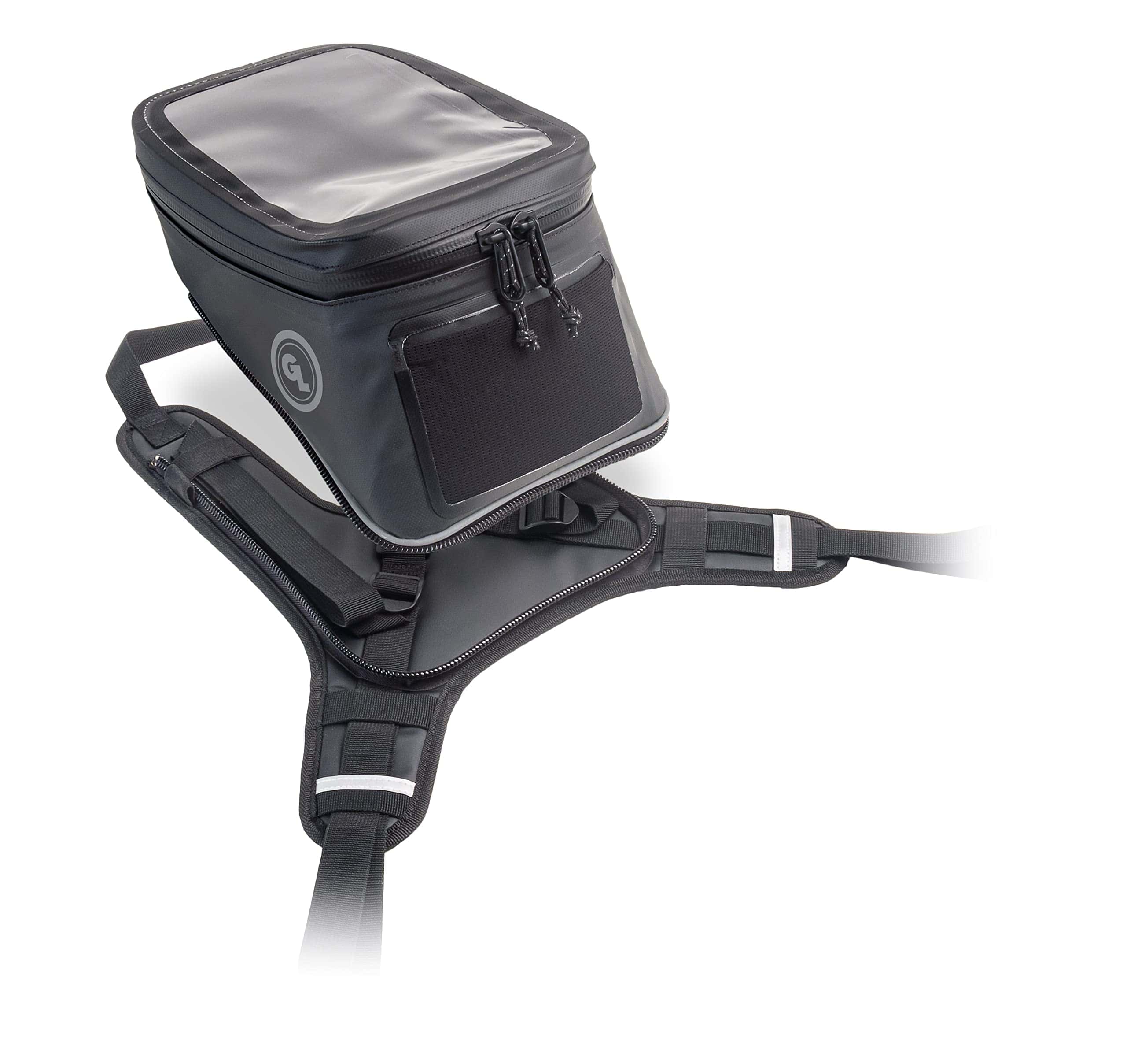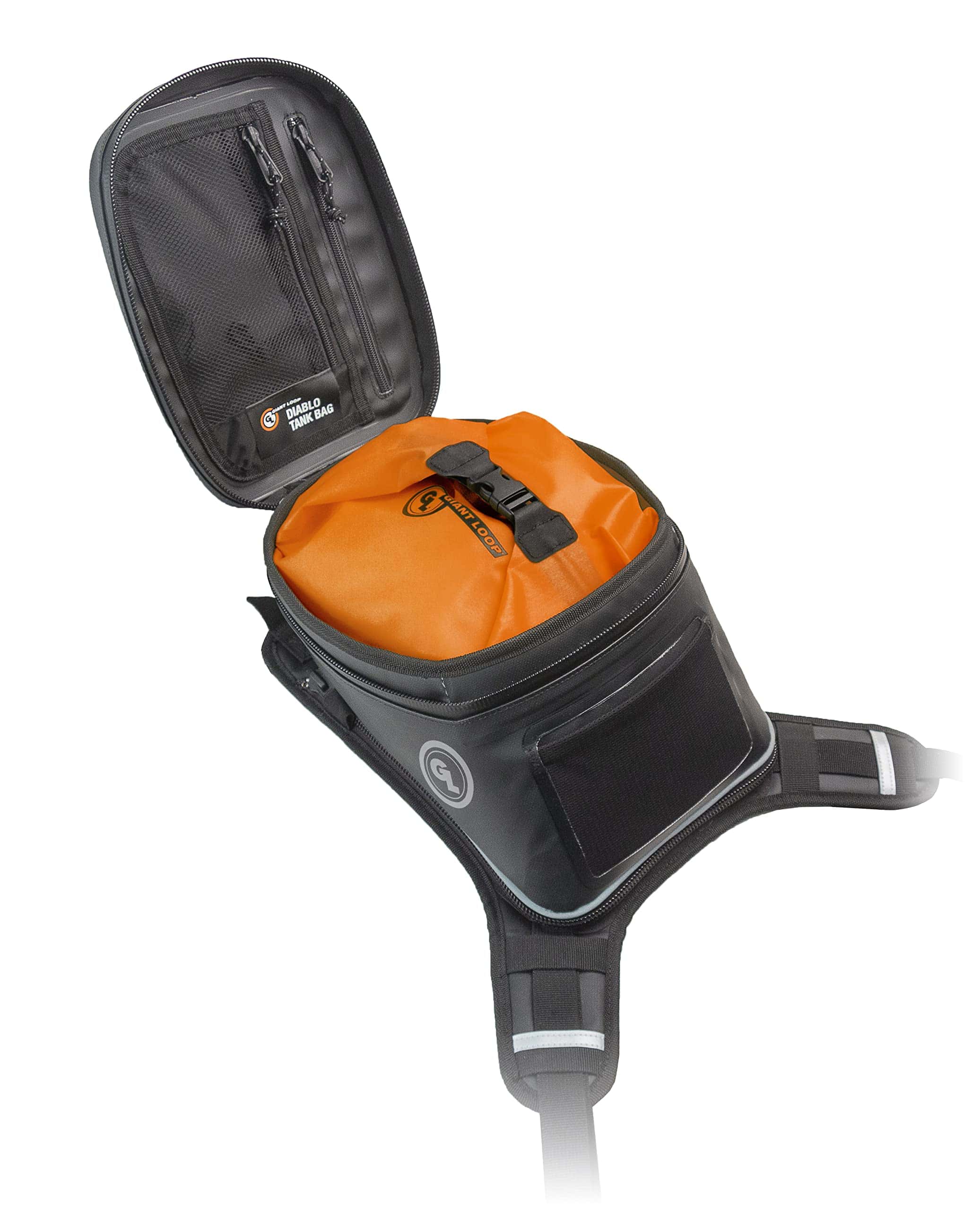 La Bolsa de Tanque Diablo de 6 litros de Giant Loop ofrece características amigables para el piloto como su homóloga más grande, la Fandango, mientras mantiene un diseño minimalista, delgado y recortado. Incluso al estar de pie en los estribos y conduciendo fuera de la carretera, el Diablo nunca se interpone en el camino, gracias a su diseño compacto. El Diablo se ajusta prácticamente a cualquier moto de tierra, moto de nieve, enduro, deporte dual, aventura o motocicleta de calle debido a su versátil sistema de montaje de arnés universal que se sujeta al chasis. La bolsa se puede abrir parcialmente desde el arnés para acceder al llenado de combustible o quitarse por completo y llevarse por el asa. A los fotógrafos les encanta la bolsa de tanque Diablo por el material interior de gancho y bucle que es compatible con muchos separadores de bolsas de cámara, y por la facilidad de acceso a la bolsa mientras se está sentado en la motocicleta. Combina el Diablo con los Bolsillos de Alforja y la Bolsa de Manillar Zigzag de Giant Loop para obtener aún más volumen de almacenamiento en el sendero. Respaldado por Giant Loop.