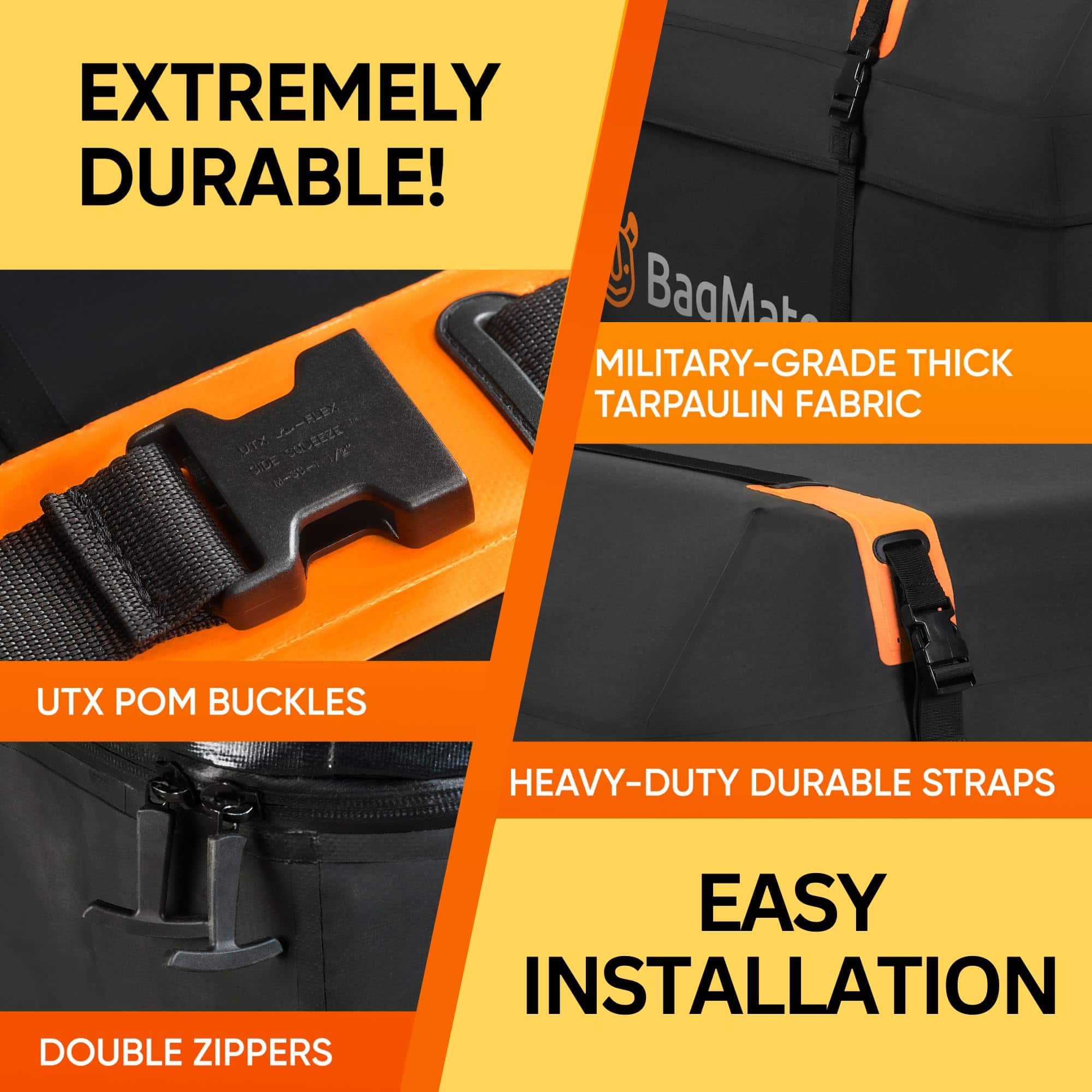 Todo listo para irte de aventura con una bolsa de carga para el techo del auto de BAGMATE! Tu gran bolsa de techo de 19 pies cúbicos mantiene todo lo que necesitas de forma segura fuera del camino, para que puedas relajarte y salir a la carretera! ¿Mal tiempo? No te preocupes. Tu bolsa de almacenamiento para el techo del auto es 100% impermeable y mantiene tus cosas seguras a través de la nieve, el sol o la lluvia gracias a su lona recubierta y cremalleras! Disfruta de la seguridad de una bolsa de carga para el techo del auto que pone la seguridad en primer lugar. A diferencia de otras bolsas para el techo, tu bolsa de carga para el techo del auto incluye 4 ganchos para puertas que no pasan por el auto e interfieren con las bolsas de aire. ?Para cualquier auto? Racks de techo, no hay racks de techo, ¡cada vehículo es un recipiente para tu caja de carga para el techo! Asegura tus ganchos de puerta alrededor de los racks O engánchalos en el interior del auto y confía en su firme agarre. Excelente como parrilla de equipaje para SUVs. ¡Experimenta nuestro compromiso – Libera espacio tanto en tu vehículo como en tus pensamientos con Bagmate! ¡Te garantizamos calidad duradera y buscamos mejorar tu próximo viaje por carretera con una experiencia incomparable!