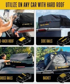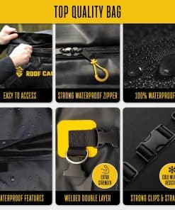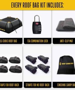 Made from durable military-grade tarpaulin, our heavy-duty cartop cargo carrier is designed to withstand all climates and weather conditions without breaking, moving, or leaking. Our vehicle roof storage system is designed with 100% waterproof features and zippers. Our lockable zips have been developed and improved over the years to ensure your luggage arrives just as you packed it dry, safe, and secure. The softshell car roof box also features double-layer welded components as well as freeze-resistant clips & straps, for a roof bag that will last. Our rooftop cargo carrier is compatible with all hard roofed cars and SUVs, utilizing a flexible mounting system. Take advantage of our simple step-by-step manual and instructional video for a fast and easy set-up. We�ve got you covered because every Tool Guards car roof bag comes with straps for every type of installation and set up. We include both sets of straps for installation on cars with roof racks and those which have no overhead roof racks. Also included with the roof bag, is a protective roof topper mat to prevent scratches or slipping, a carry bag for easy storage when not in use, and a TSA-approved padlock, for that extra level of security.