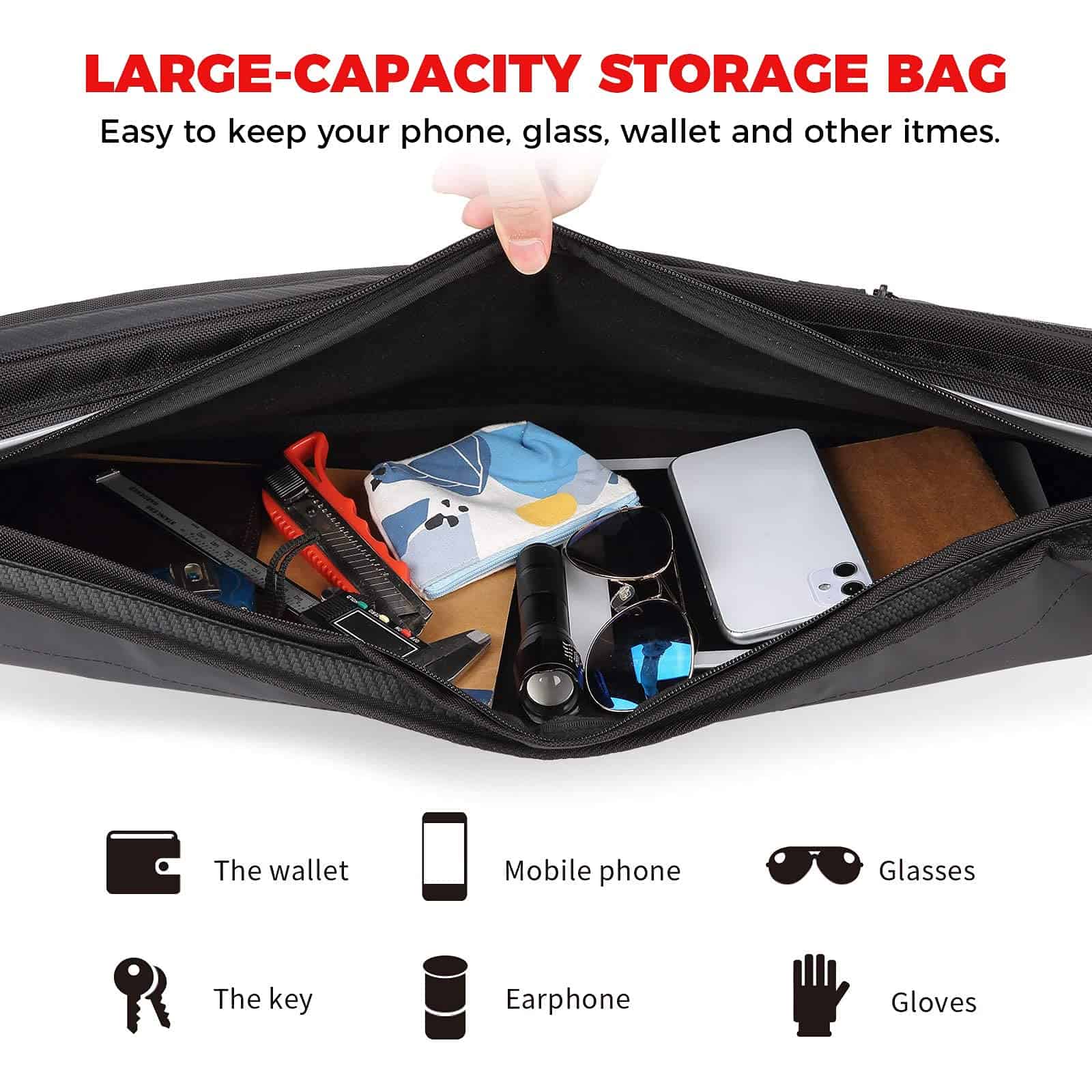 1. Gran capacidad – La bolsa de techo UTV KEMIMOTO con múltiples espacios de almacenamiento, bolsa de película transparente 150mm 85mm (para almacenar teléfonos móviles, mapas, etc.), una pequeña bolsa con cremallera, una bolsa mediana con cremallera y un compartimento extra largo con cremallera con un borde, que puede almacenar guantes, prismáticos, suministros de primeros auxilios, pequeñas herramientas de reparación y otros artículos.