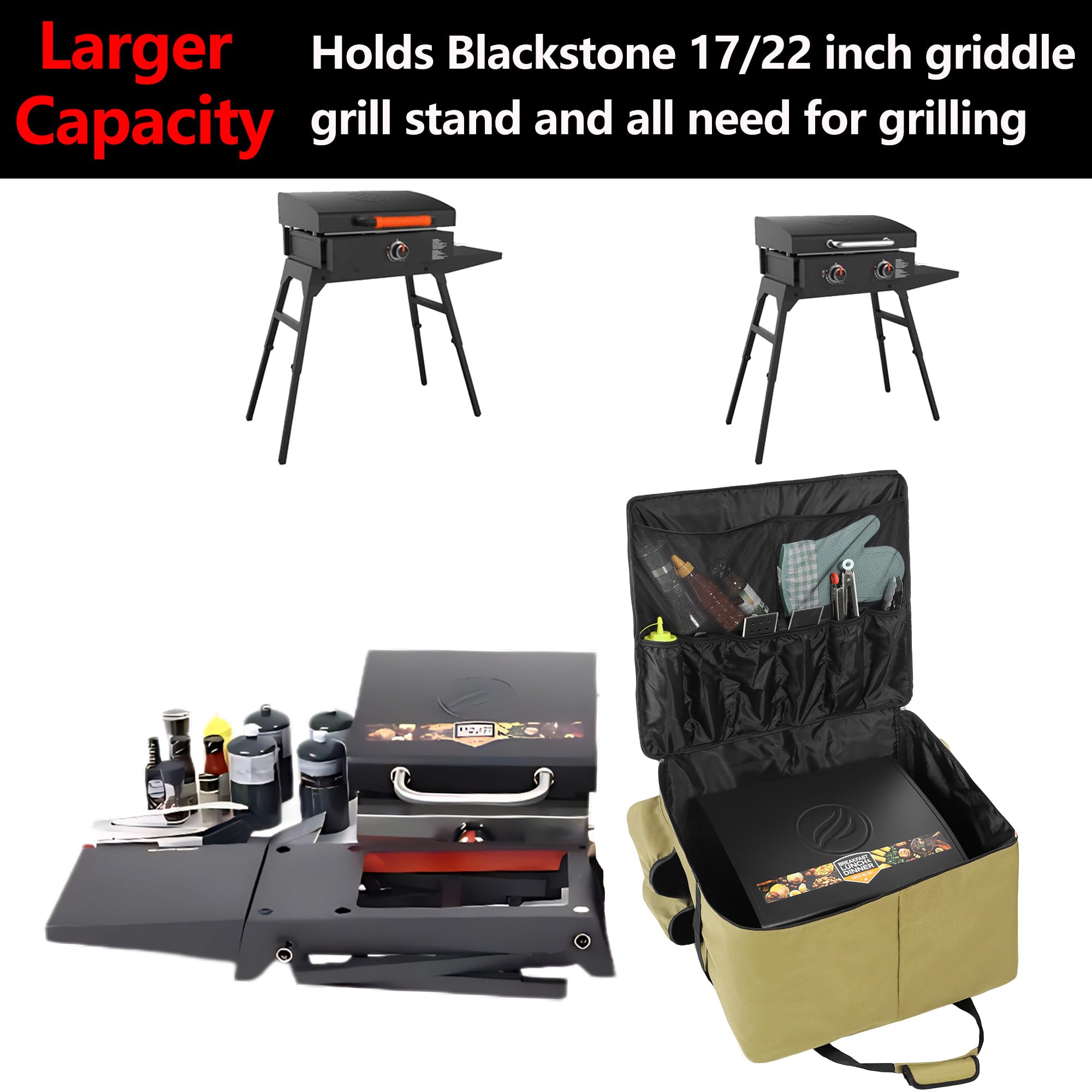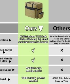 5. Portabilidad sin esfuerzo: La bolsa de accesorios para parrilla Blackstone cuenta con dos asas ergonómicas para un transporte fácil y cómodo. Ya sea que estés moviendo tu parrilla al patio trasero o a un campamento, lo harás con facilidad. Cada transporte será una experiencia suave y agradable, permitiéndote concentrarte en disfrutar de tu barbacoa en lugar de lidiar con una preparación complicada.