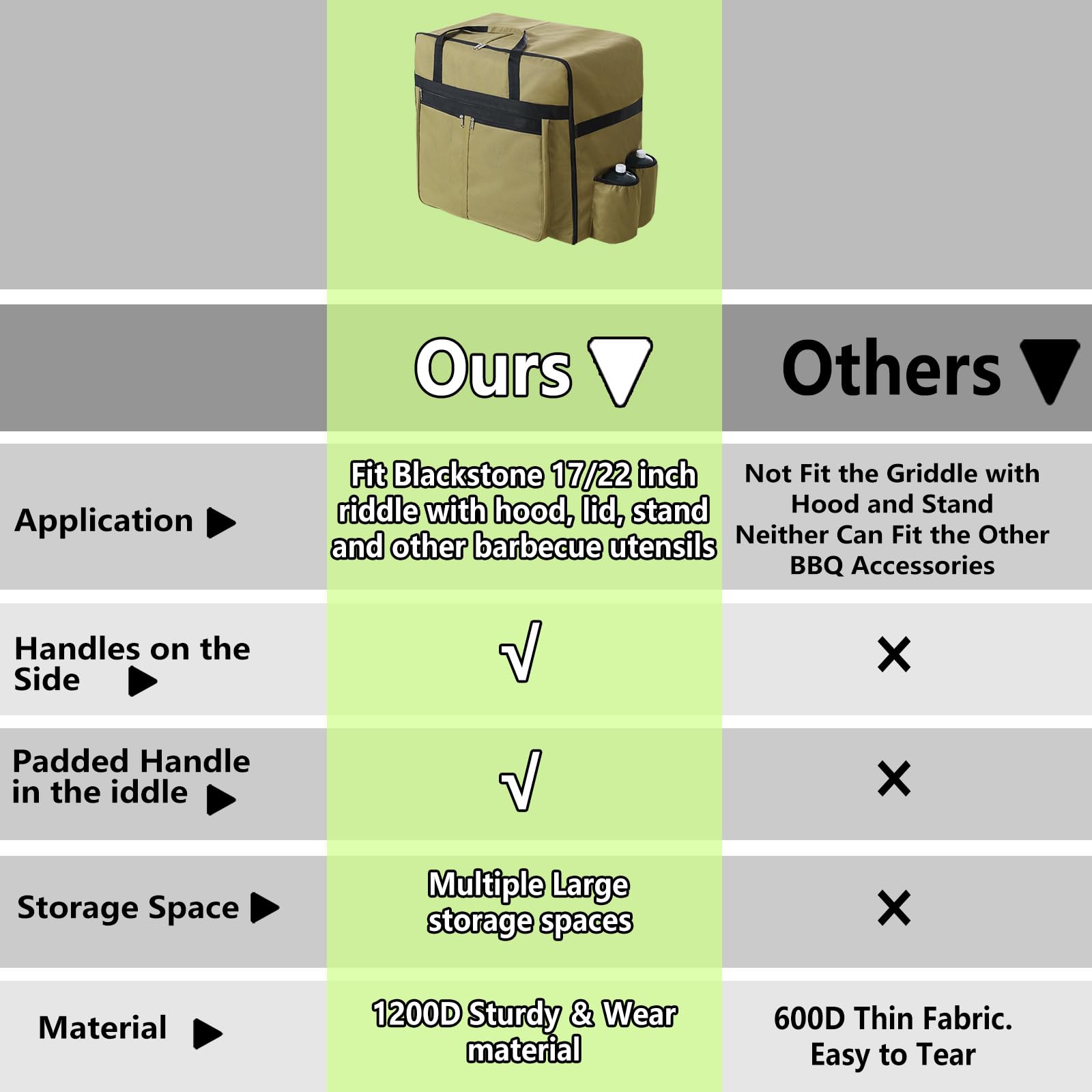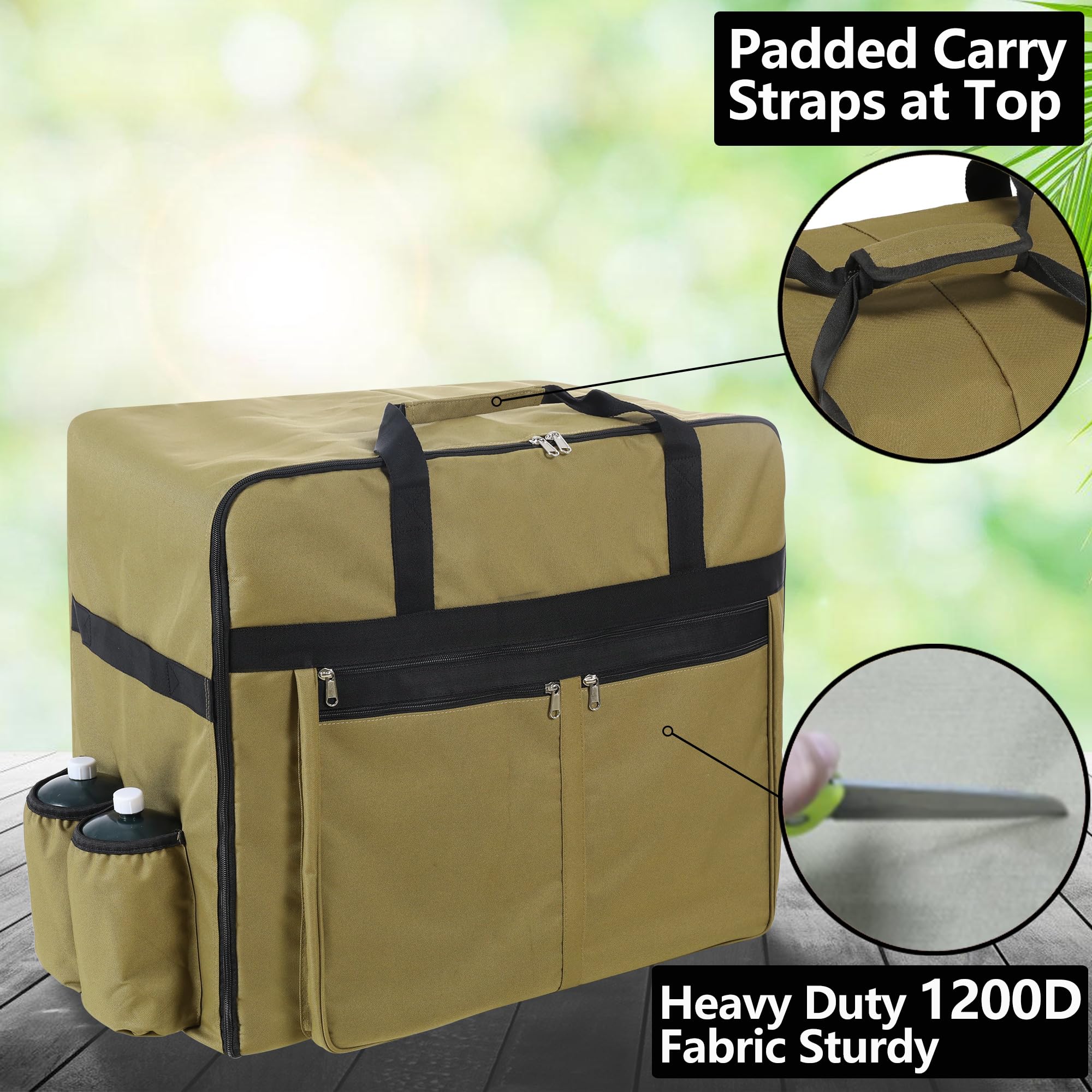 2. Durabilidad superior: Cuando tomas la bolsa de transporte para parrilla Blackstone de 22 pulgadas, sentirás la confianza de su resistente tela Oxford 1200D. Este material de grado militar dura más que el material 600D estándar utilizado por la competencia. El diseño de doble asa y el forro acolchado brindan mayor comodidad durante el transporte. Esta construcción y diseño cuidadosos ofrecen la mejor protección tanto para tu equipo como para ti.