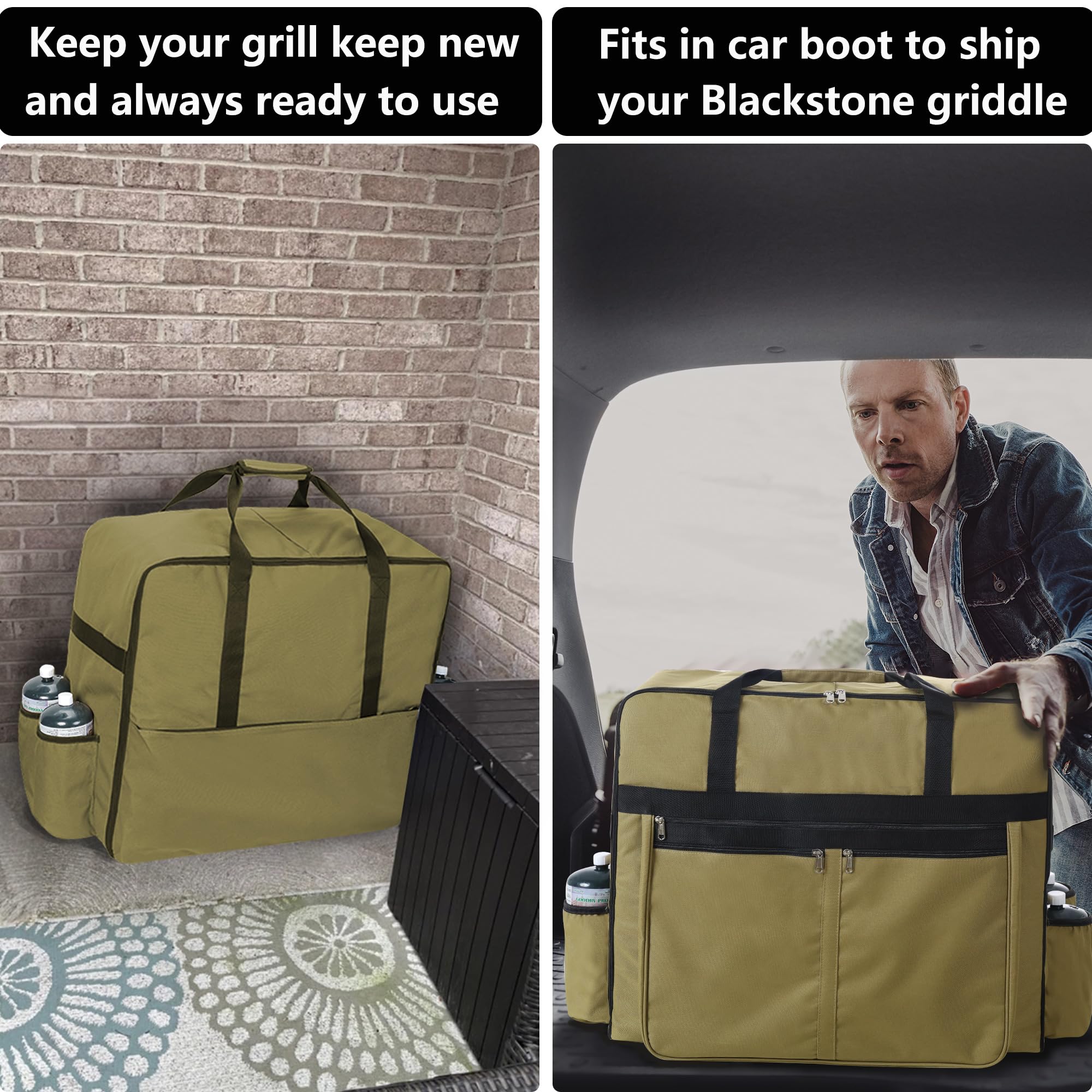 1. Protección definitiva: Imagina que tu bolsa de transporte para parrilla Blackstone de 17 pulgadas y la bolsa de transporte para parrilla Blackstone de 22 pulgadas se mantienen perfectamente protegidas, sin importar si es un sol ardiente, nieve o polvo. Nuestra bolsa de accesorios para parrilla Blackstone asegura que tu parrilla y accesorios estén protegidos de los elementos, ya sea almacenados en tu garaje, cuarto de almacenamiento o RV. Esto significa que puedes concentrarte completamente en disfrutar de tu barbacoa sin preocuparte por daños en el equipo.