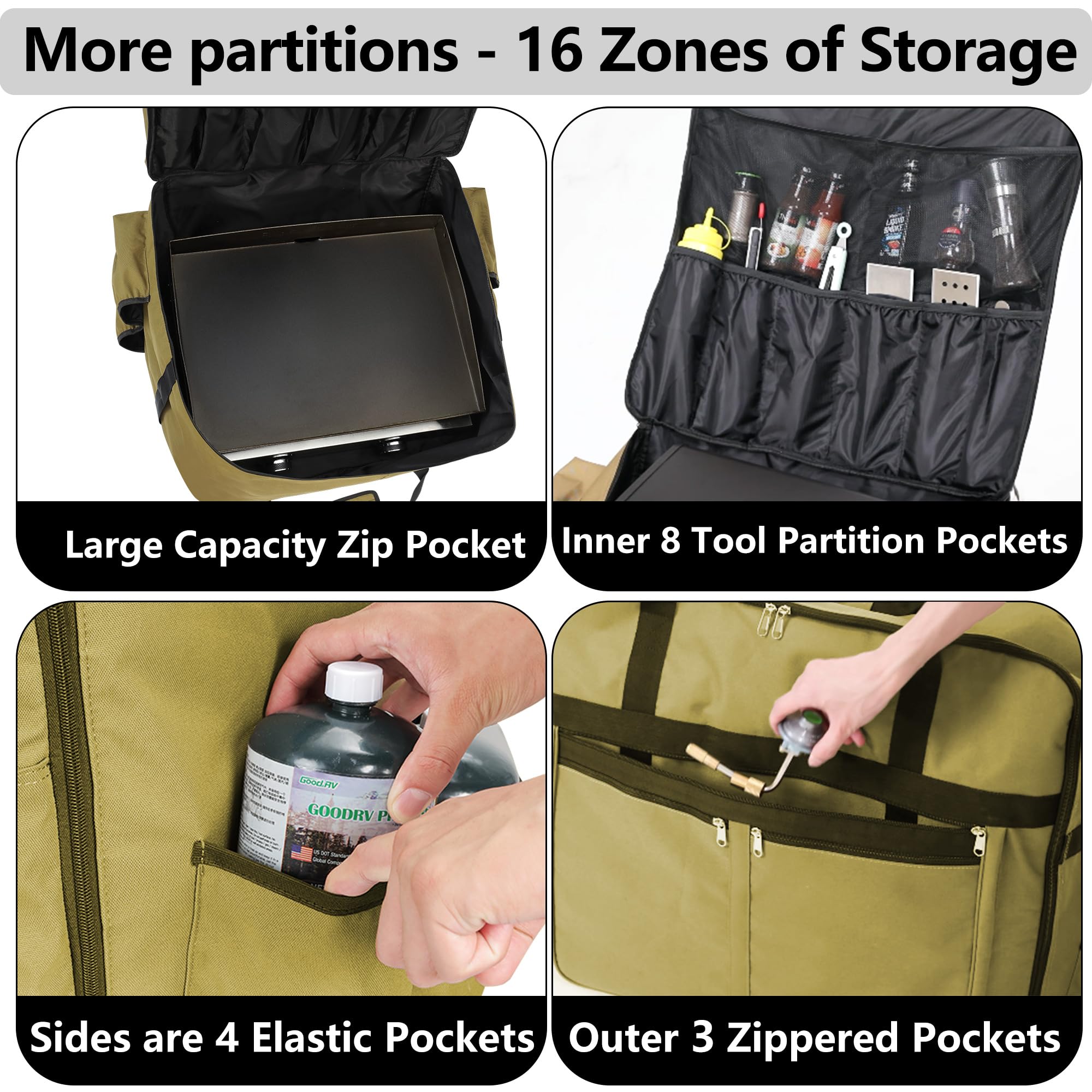 3. Organización versátil: ¡Di adiós a buscar herramientas de barbacoa perdidas! Con 16 bolsillos de diferentes tamaños, nuestra bolsa de transporte para parrilla Blackstone garantiza que cada accesorio tenga su lugar. Ya sea acampando, organizando una fiesta en el patio trasero o haciendo una barbacoa con amigos, este diseño bien organizado mantiene todas tus herramientas y accesorios al alcance, listos para cualquier ocasión.