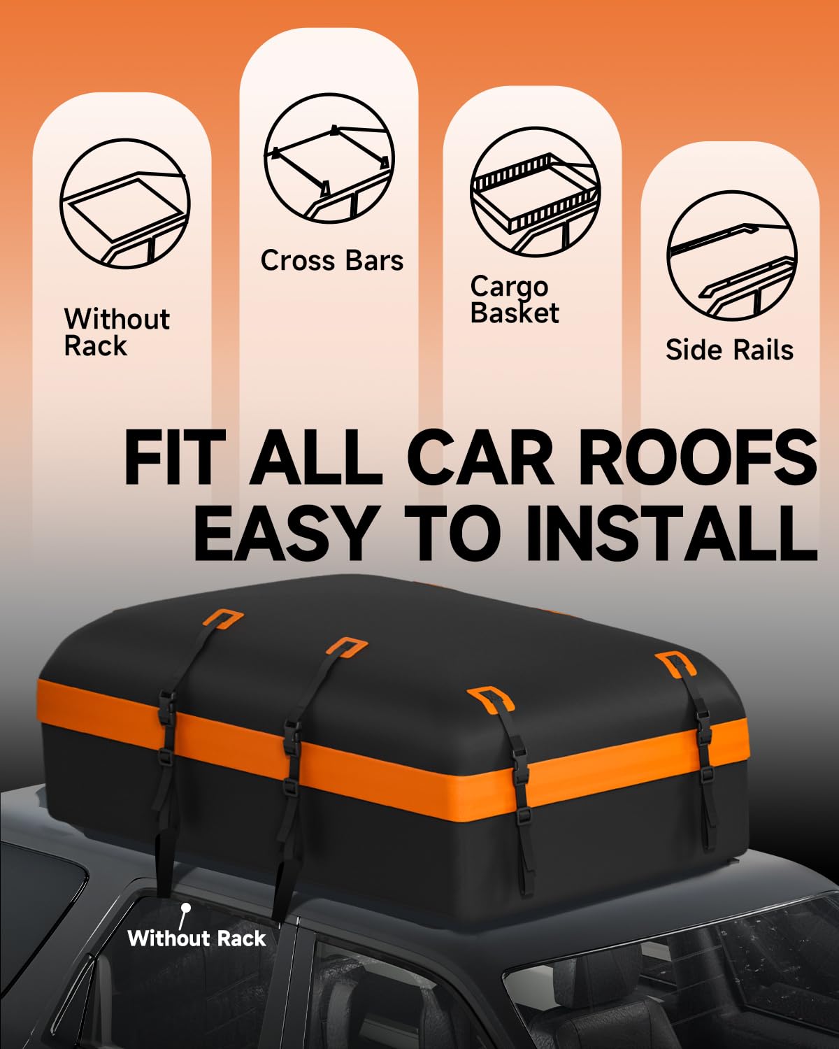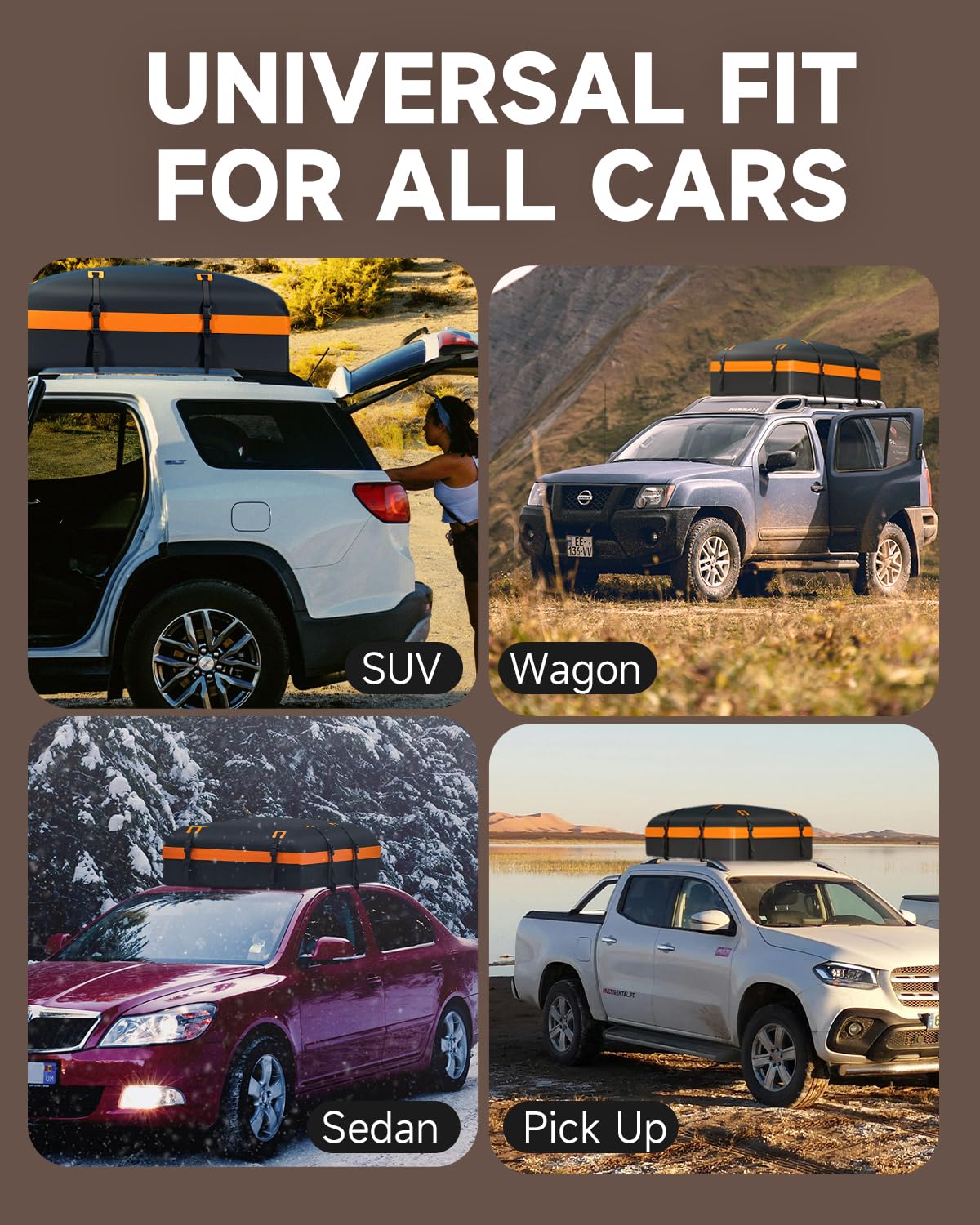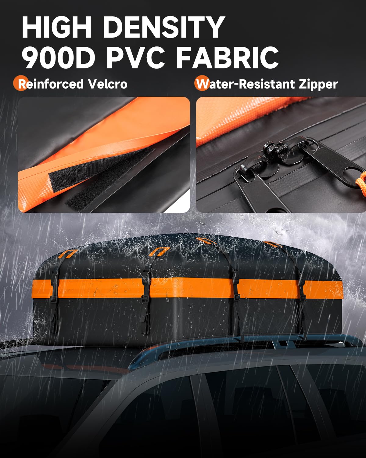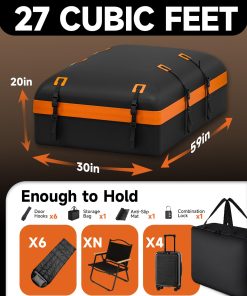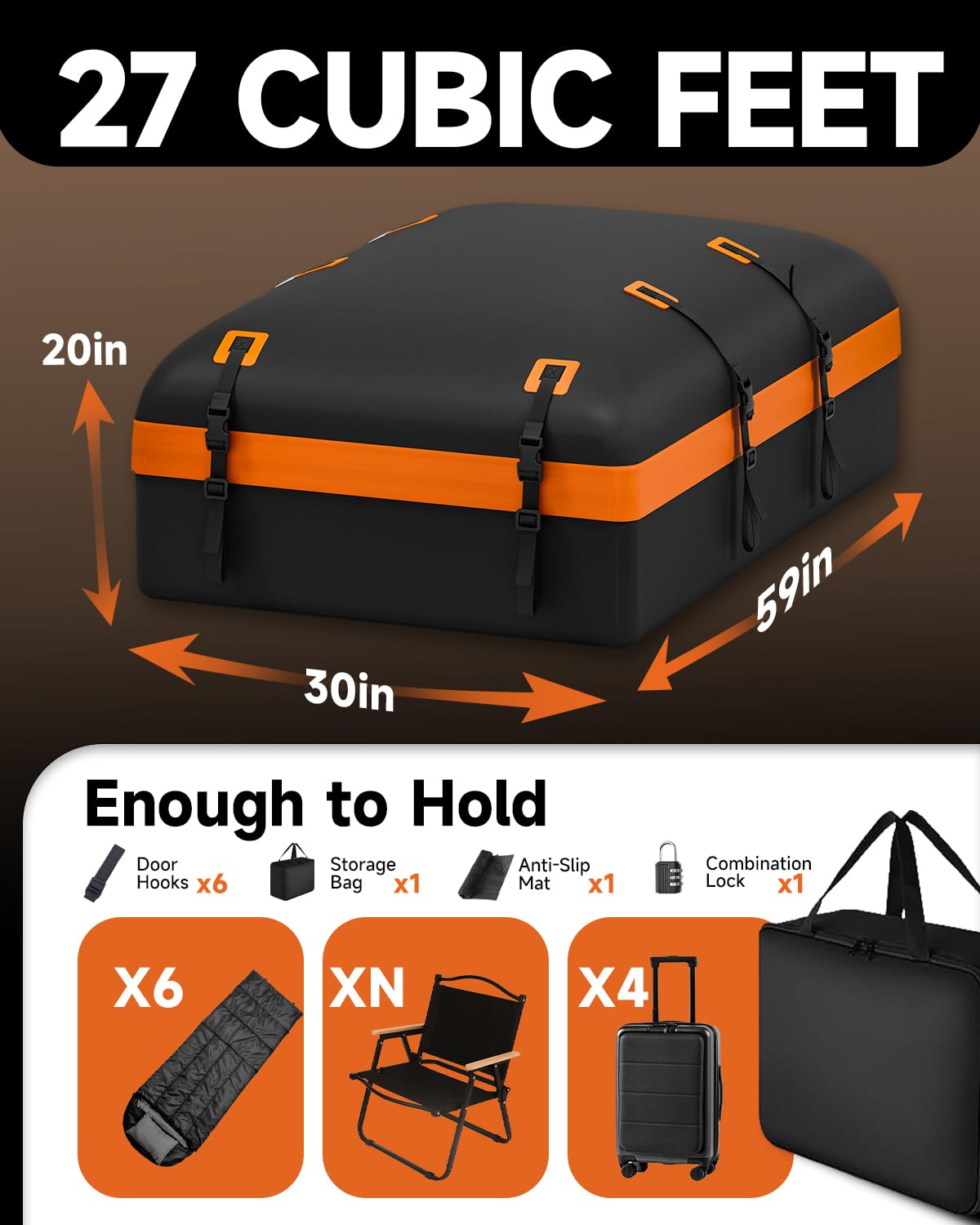 1. Espacio de almacenamiento extra grande: Con dimensiones de 59 x 39 x 20 pulgadas. Esta bolsa de techo de coche ofrece 27 pies cúbicos de espacio de almacenamiento, para almacenar fácilmente el equipaje de una familia de 5-6 personas, satisfacer todas sus necesidades de almacenamiento para aventuras al aire libre.