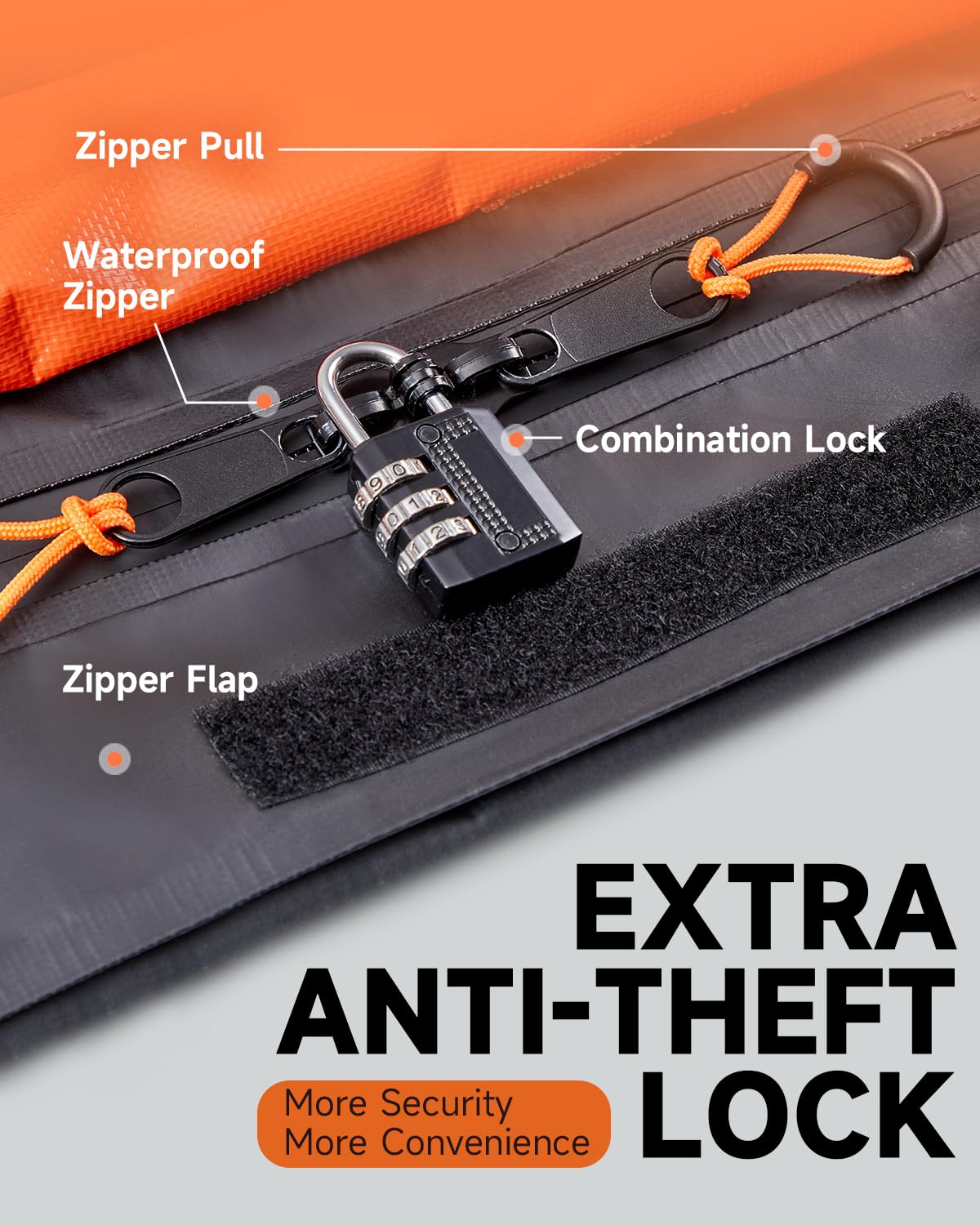 4. Antideslizante y antirrobo: Equipada con un tapete antideslizante, esta bolsa de transporte para techo de coche permanece segura al conducir a altas velocidades y protege el techo de tu coche de arañazos. También incluye un candado con código para prevenir robos.