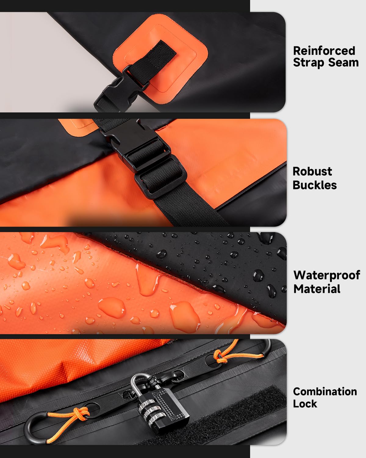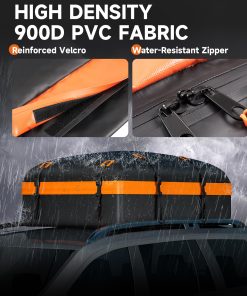 3. Resistente a rasgaduras: La bolsa de transporte para techo de coche está diseñada para durar, con tela de PVC 900D resistente a la abrasión que puede soportar condiciones climáticas adversas y un manejo brusco. Las costuras soldadas triples reforzadas proporcionan mayor resistencia para evitar desgarros, haciéndola ultra duradera y confiable.