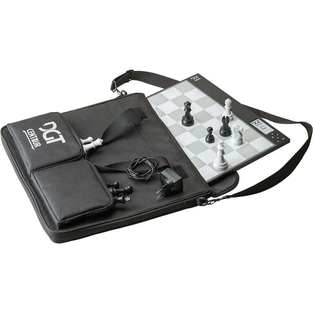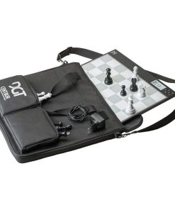 Para llevar el DGT Centaur a donde quiera que vaya, hicimos una bolsa de viaje especialmente diseñada. Además del tablero, las piezas y el cargador se pueden almacenar ordenadamente. También adecuado para juego de ajedrez con tablero de hasta 40 x 40 cm (16″ x 16″)