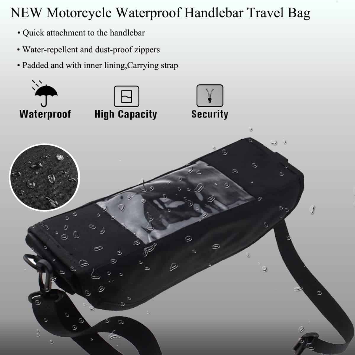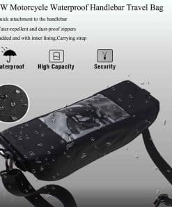 Bolsa de viaje impermeable para manillar de motocicleta VORILES diseñada para aventuras en moto. Confeccionada con tela de alta calidad y cremallera resistente al agua para proteger tus pertenencias en cualquier condición climática. Esta bolsa de viaje incluye espacio suficiente para llevar tus artículos esenciales mientras conduces. El diseño moderno y funcional ofrece comodidad y practicidad. ¡No dejes que el mal tiempo arruine tus viajes en motocicleta, lleva esta bolsa contigo y disfruta de la aventura sin preocupaciones!