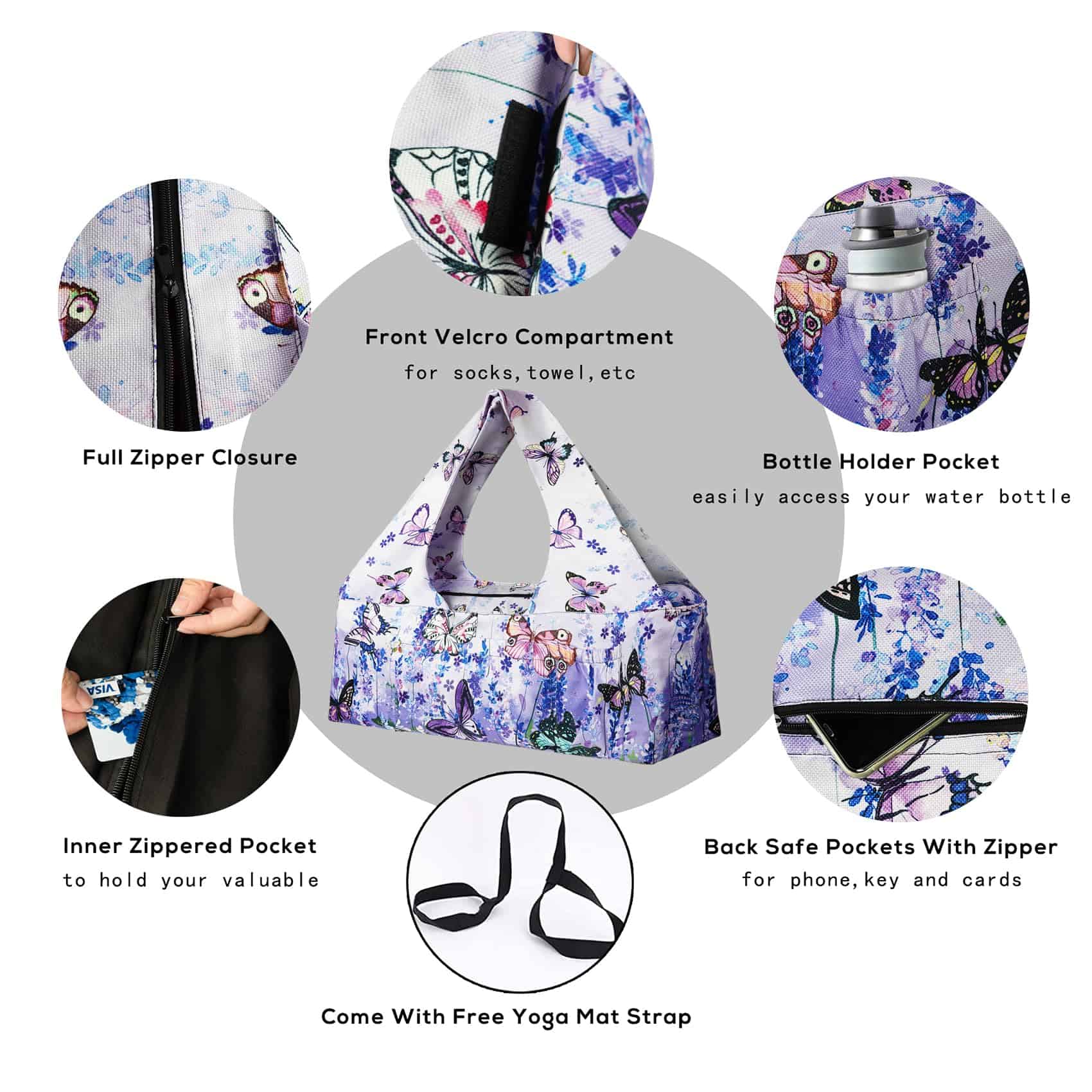 El diseño de la bolsa cuenta con un cierre de cremallera completo en el compartimento principal y 5 bolsillos multiusos. Con un bolsillo grande exterior con velcro, 2 bolsillos con cremallera segura en la parte trasera, 1 pequeño bolsillo interior con cremallera y un portabotellas, tendrás espacio más que suficiente para organizar tus objetos personales y accesorios de yoga. Puedes llevar contigo 2 tapetes de yoga, bloques de yoga, bolsters, toallas, botellas de agua y mucho más. La bolsa se adapta a la mayoría de los tamaños de tapetes de yoga, desde 3mm hasta 10mm.