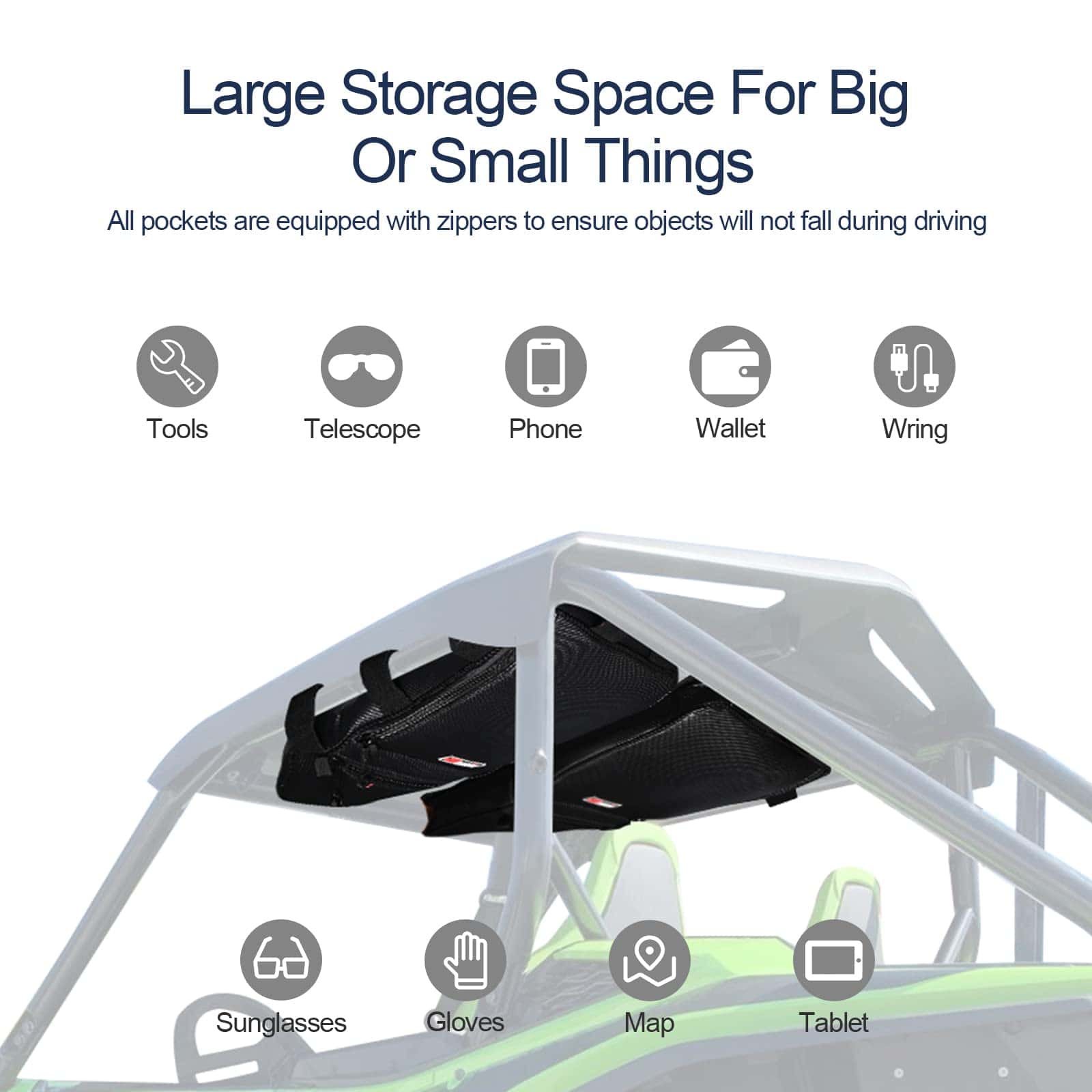 3. CAPACIDAD DE ALMACENAMIENTO ADICIONAL: Las bolsas en el techo para talon 1000 se instalan en la parte superior de su UTV, proporcionan un gran y espacio de almacenamiento adicional para usted. Los bolsillos principales son largos y grandes, para llevar objetos largos como martillos, herramientas, mapas. La bolsa de almacenamiento en el techo también está equipada con un bolsillo triangular para llaves, gafas de sol, guantes, cuadernos, billeteras, teléfonos y otros objetos más pequeños. Todos los bolsillos están equipados con cremalleras para asegurar que los objetos no caigan durante la conducción y hacer que su talón quede ordenado de inmediato.