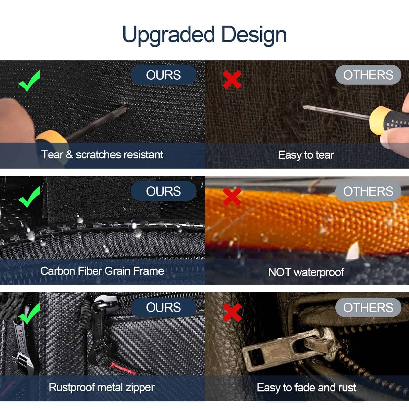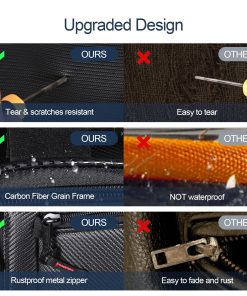 2. MATERIAL DE CALIDAD: El material principal de la bolsa de almacenamiento en el techo talon 1000 está hecho de vinilo resistente al agua de grado marino con patrón de fibra de carbono, lo que lo hace más sólido y suave, con alta elongación y excelente resistencia al desgarro cuando se somete a fuerza de tracción externa y dura mucho más tiempo, lo que proporciona una excelente protección contra arañazos, desgaste, desgarre y polvo. El material de PVC en la parte posterior de la bolsa de almacenamiento en el techo UTV puede evitar que el agua y la nieve ingresen.
