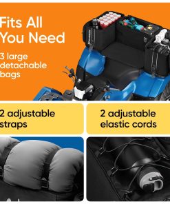 1. SE ADAPTA A TODO LO QUE NECESITAS. Esta bolsa de carga para ATV consta de 3 grandes compartimentos desmontables con espacio de almacenamiento extra en la parte superior de las bolsas quad: 2 cuerdas elásticas ajustables y 1 par de correas ajustables.