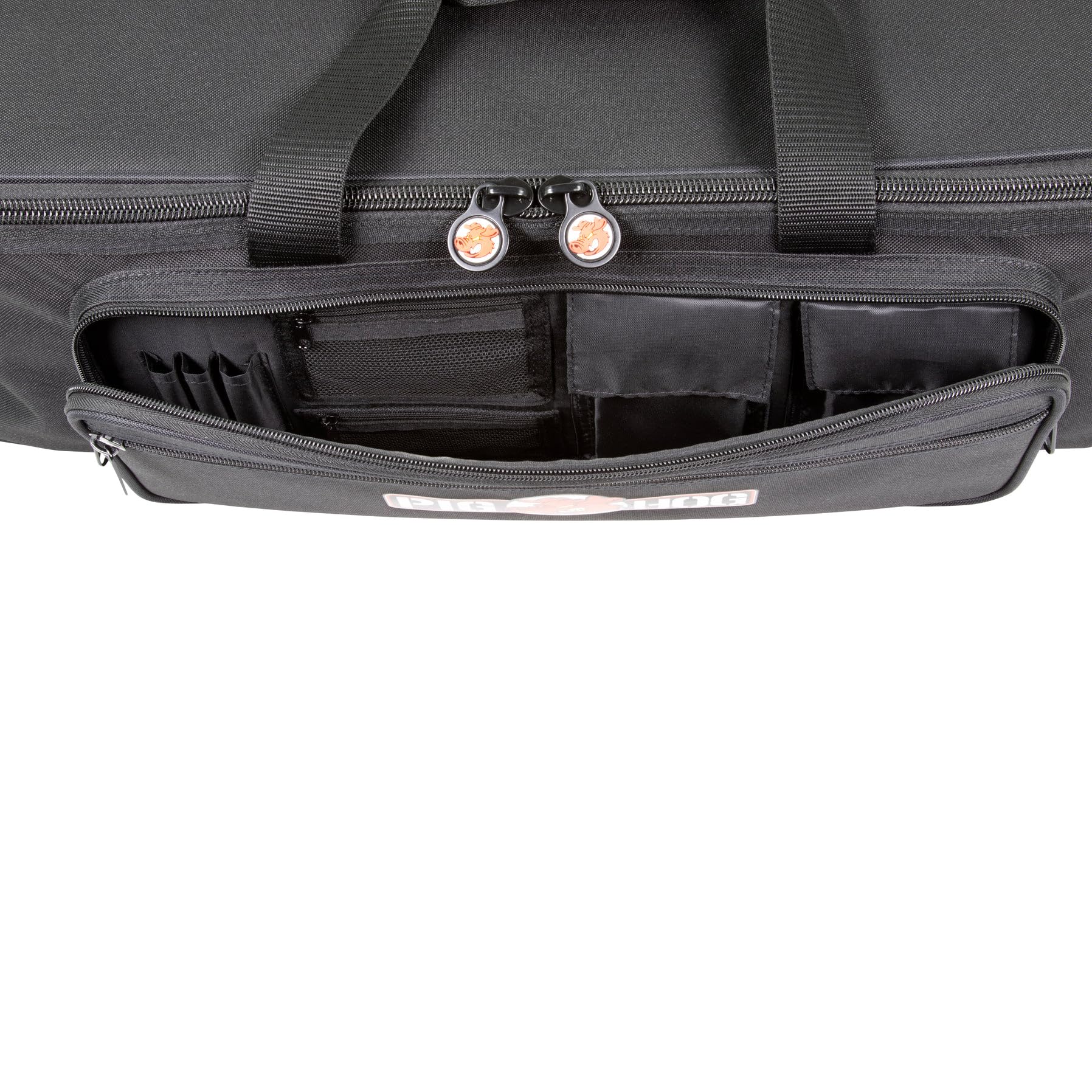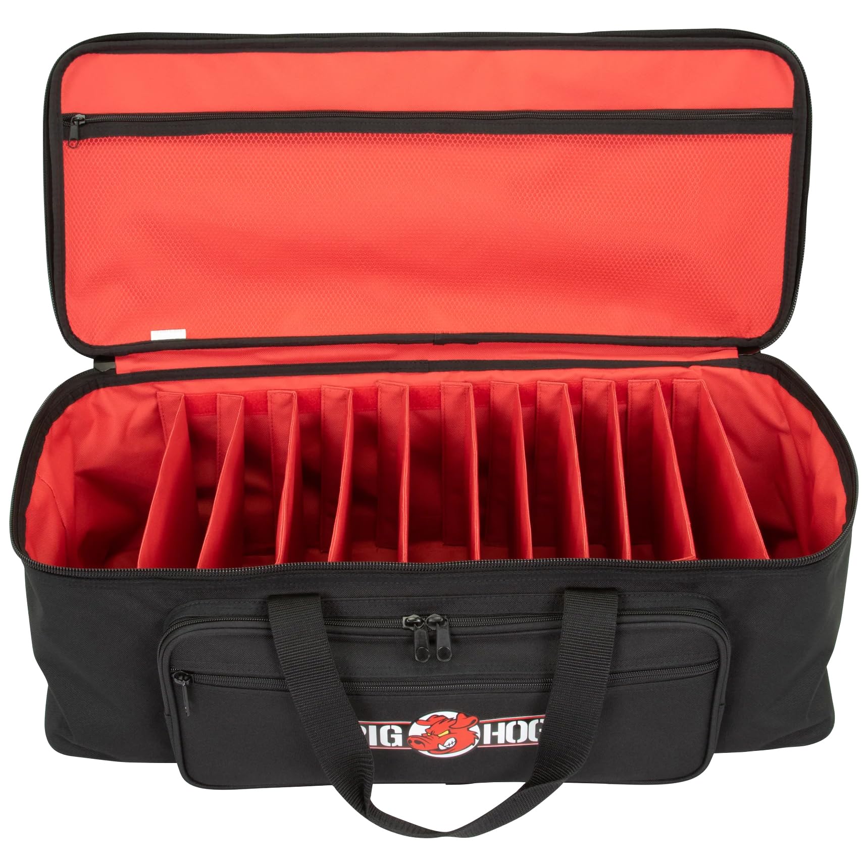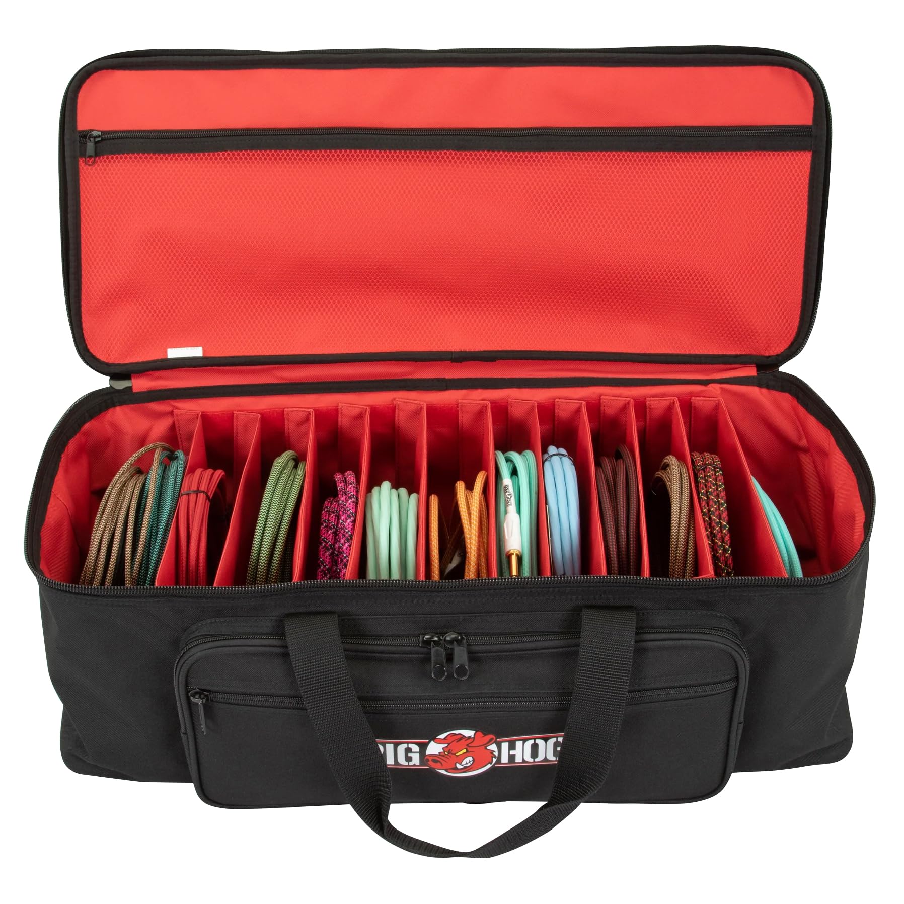 La bolsa organizadora de cables Pig Hog PHCOB-LG es la forma definitiva de enfrentarse a las condiciones de gira más agotadoras imaginables. La bolsa se adapta a tus necesidades con 11 divisores rígidos extraíbles que se pueden instalar en cualquier lugar a lo largo de la bolsa, creando hasta una docena de compartimentos para cualquier cable o accesorio que le lances. El interior rojo brillante mantiene todos tus equipos fácilmente identificables. Además, el bolsillo frontal cuenta con dos bolsillos de malla con cremallera más pequeños, dos bolsillos de solapa de Velcro expandibles y tres compartimentos para bolígrafos, para la máxima organización. Las asas de tela resistente y la correa de hombro desmontable están ambas acolchadas para facilitar el transporte. No te conformes con nada menos que la bolsa organizadora de Pig Hog para la gestión de tus cables.