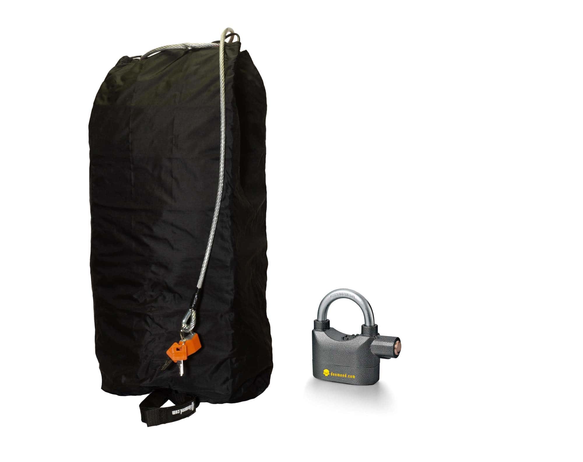 Bolsa para Casco, Antirrobo, Impermeable, Anti-Corte, 18 Metros de Cable de Acero en el Interior, Candado con Alarma, Bolsa de Seguridad para 2 Cascos. Nuestra bolsa para casco de motocicleta está hecha de 3 capas de tela: la capa interna de la bolsa está hecha de suave tela Evolon, la parte intermedia está hecha de poliéster, la capa exterior está hecha de nailon impermeable y 18 metros de cable de acero formado en una red e insertado entre dos capas de tela, tensión de acero, cuerda de PVC aislada, de diámetro 10 mm. La bolsa doble para casco es lo suficientemente grande para… (description continues)