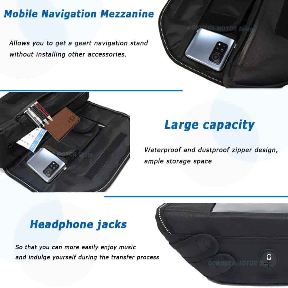 (2) Singularidad: El compartimento principal grande dentro de esta bolsa cuenta con una cremallera impermeable y a prueba de polvo para mantener cerrado el interior de la bolsa. Para mantener tu teléfono cargado mientras viajas, esta bolsa para motocicleta está equipada con un conector de cable impermeable. Proporciona un conector seguro y fiable incluso en presencia de agua.