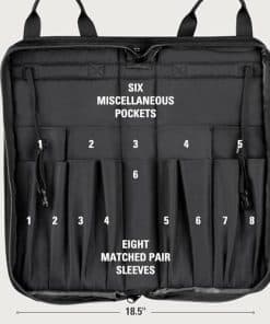 Un diseño de bolsillo especial te permite agarrar rápidamente pares emparejados de baquetas de la bolsa cada vez que necesites una. En el interior hay ocho bolsillos para baquetas, cada uno cosido para adaptarse a un par de cualquier tamaño de baquetas. Carga estos bolsillos con pares emparejados por peso y tono de modelos idénticos, o separa pares de diferentes diámetros si usas varios tamaños. Hay seis bolsillos adicionales de varios tamaños para un total de catorce bolsillos internos. Un bolsillo exterior profundo te brinda acceso rápido a repuestos y accesorios. La bolsa está equipada con dos opciones de transporte: una correa para el hombro ajustable en longitud y asas resistentes para agarrar rápidamente. Incluye ganchos y correas para suspender la bolsa en una posición abierta junto a ti en tu kit. Ideal para bateristas de gira, percusionistas, aficionados y estudiantes. Hecha con poliéster duradero 600D, respaldo de PVC, asas/correa de PP tejido y cremallera doble.