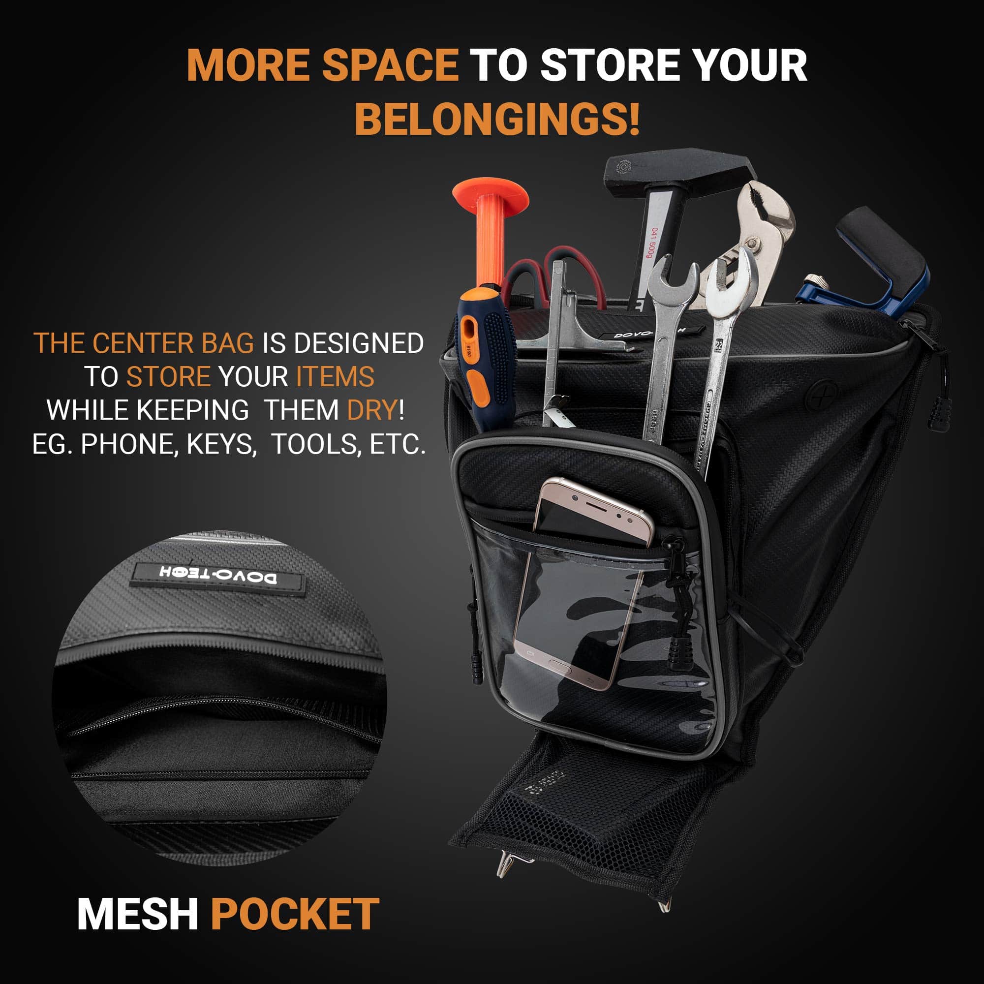 3. NUEVO DISEÑO DE CREMALLERA – UBICADO EN EL LATERAL Mientras que otras bolsas de almacenamiento para utv tienen cremalleras débiles que se rompen después de unos pocos paseos y no son resistentes al agua, Dovotech ha diseñado una nueva cremallera ubicada en el lateral: evite que el barro y el agua de lluvia caigan directamente dentro de las bolsas de almacenamiento manteniendo siempre la bolsa interna seca y limpia.