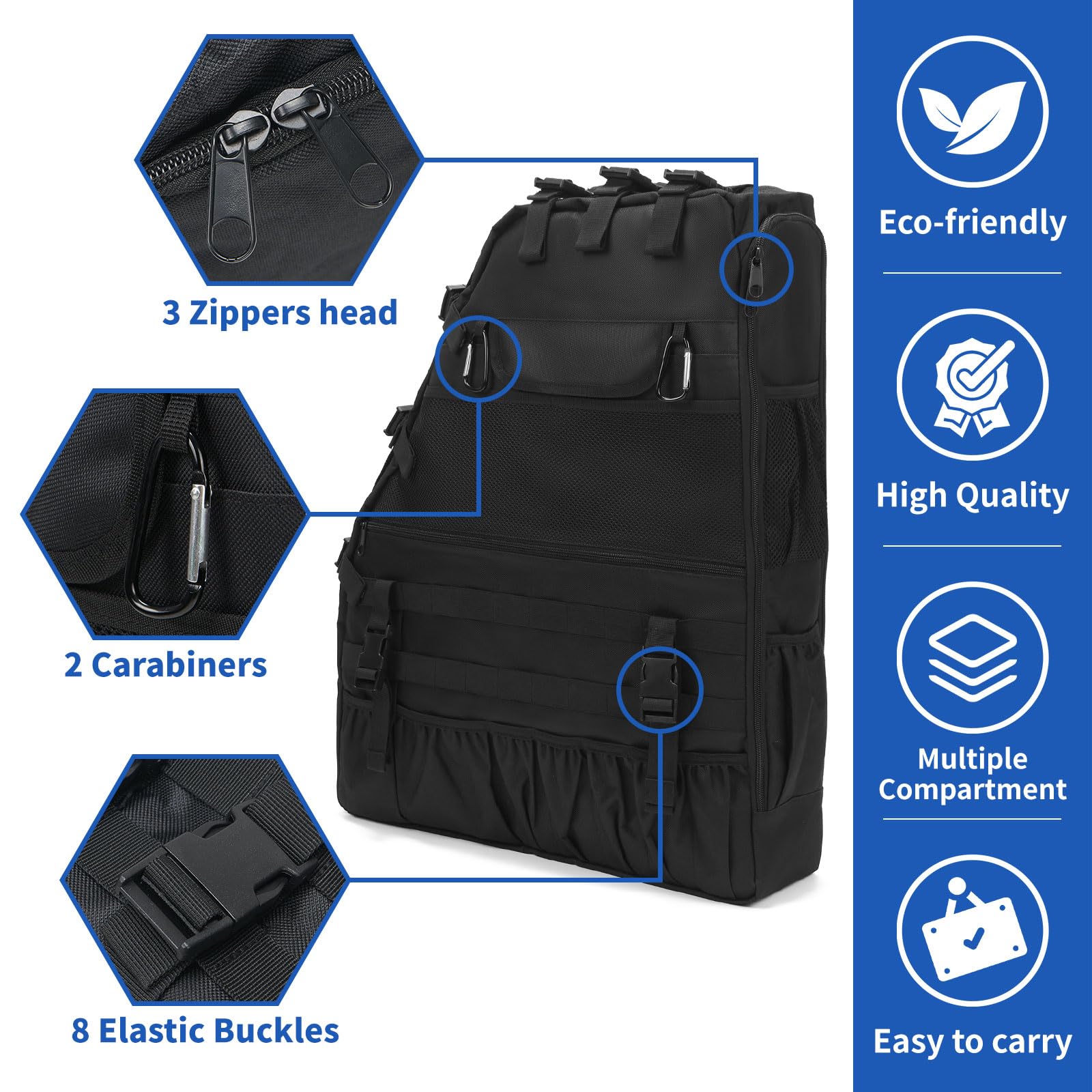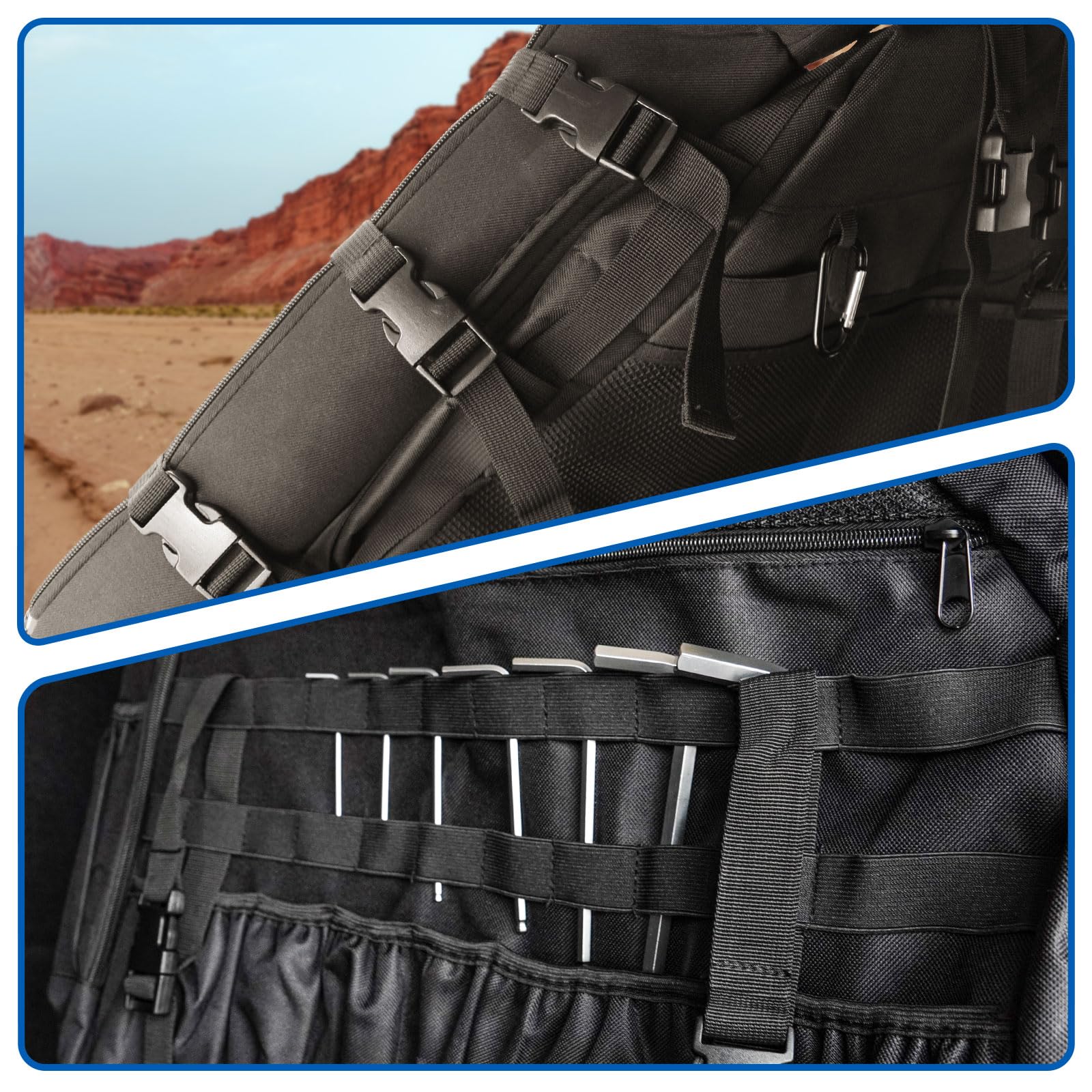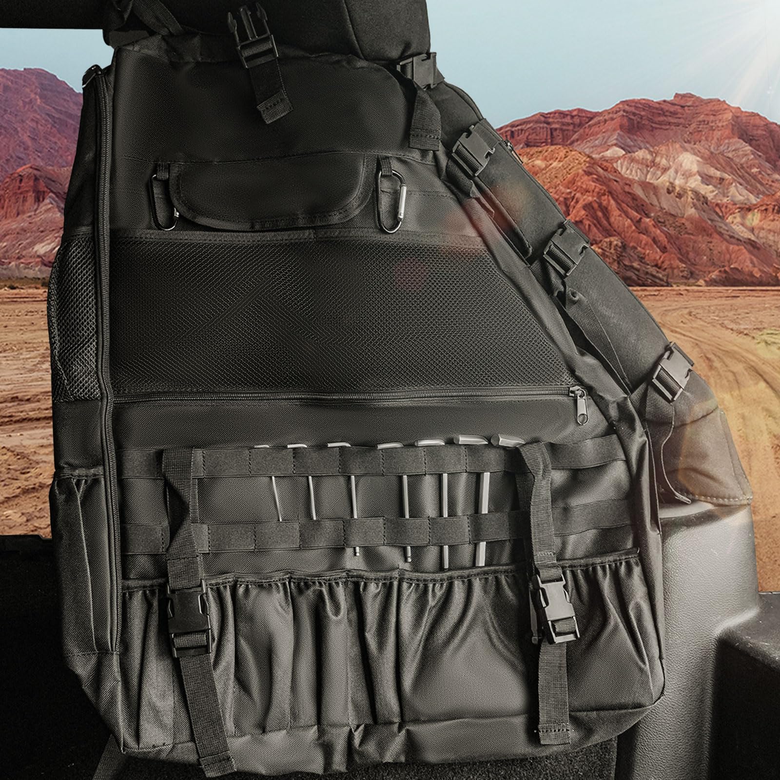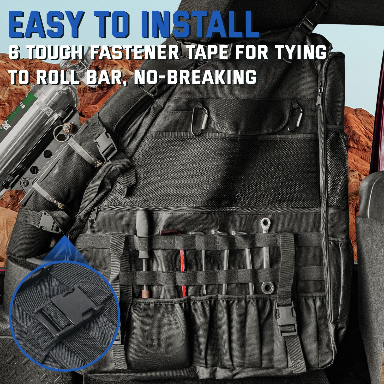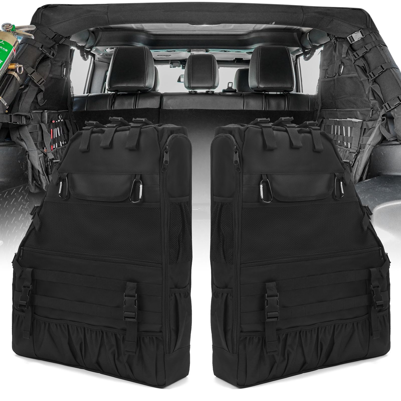 3. INSTALACIÓN FÁCIL: Se adhiere a los roll bars en el Wrangler, simplemente enganchando con las hebillas de liberación rápida. No se necesitan herramientas, correas ajustables. Más allá de la instalación en el coche, la bolsa de almacenamiento para roll bar se transforma en una mochila. Equipado con dos mosquetones de aluminio, ofrece un enganche rápido para accesorios como linternas, radios y llaves, convirtiéndose en una solución de almacenamiento multiusos esencial para senderismo, camping y viaje.