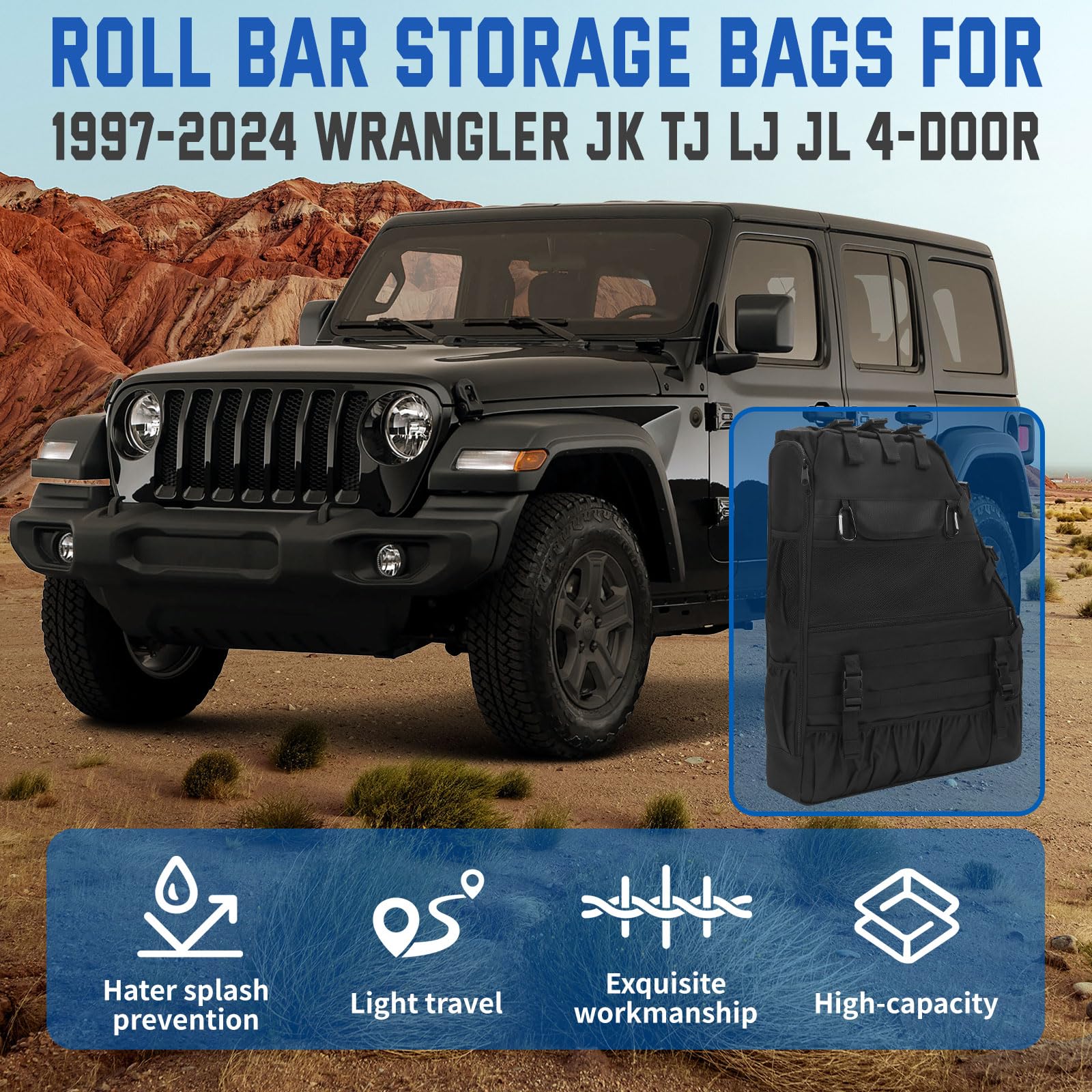 1. FITMENT: Bolsas de almacenamiento para Roll Bar JONGCOVER para Wrangler JK TJ LJ & Unlimited JL de 4 puertas (NO se ajusta a 2 puertas).