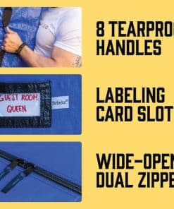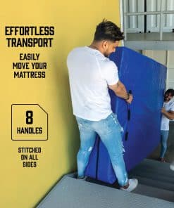 3. Asas de transporte – 8 poderosas asas están cosidas en la bolsa de colchón, lo que te permite transportar tu colchón de la manera más fácil posible. Lleva tu colchón con gracia arriba, deslízalo por pasillos estrechos y muévelo hacia espacios de almacenamiento estrechos. La bolsa también está especialmente diseñada para que una persona la pueda arrastrar por el suelo, para que puedas manejar tu colchón fácilmente por tu cuenta.