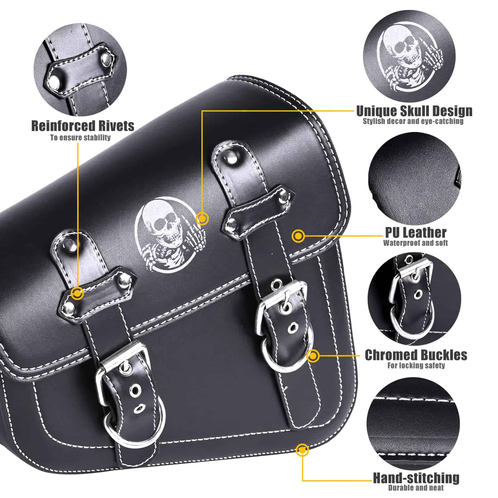 3. DECORACIÓN ÚNICA DE ESQUELETO: El patrón de esqueleto en la bolsa de sillín para Harley aporta una decoración más atractiva a tus motos. Pero ¿por qué diseñamos el patrón de cráneo? Tenemos respuestas para ti: 1. El esqueleto es un símbolo de inmortalidad, el espíritu de montar en moto es inmortal. 2. Es una forma visual de atraer a personas afines y alejar a aquellos que no se identifican con nosotros. 3. El simbolismo de cráneo expresa nuestro compromiso hasta la muerte, con la motocicleta, con nuestro club y con nuestra familia.