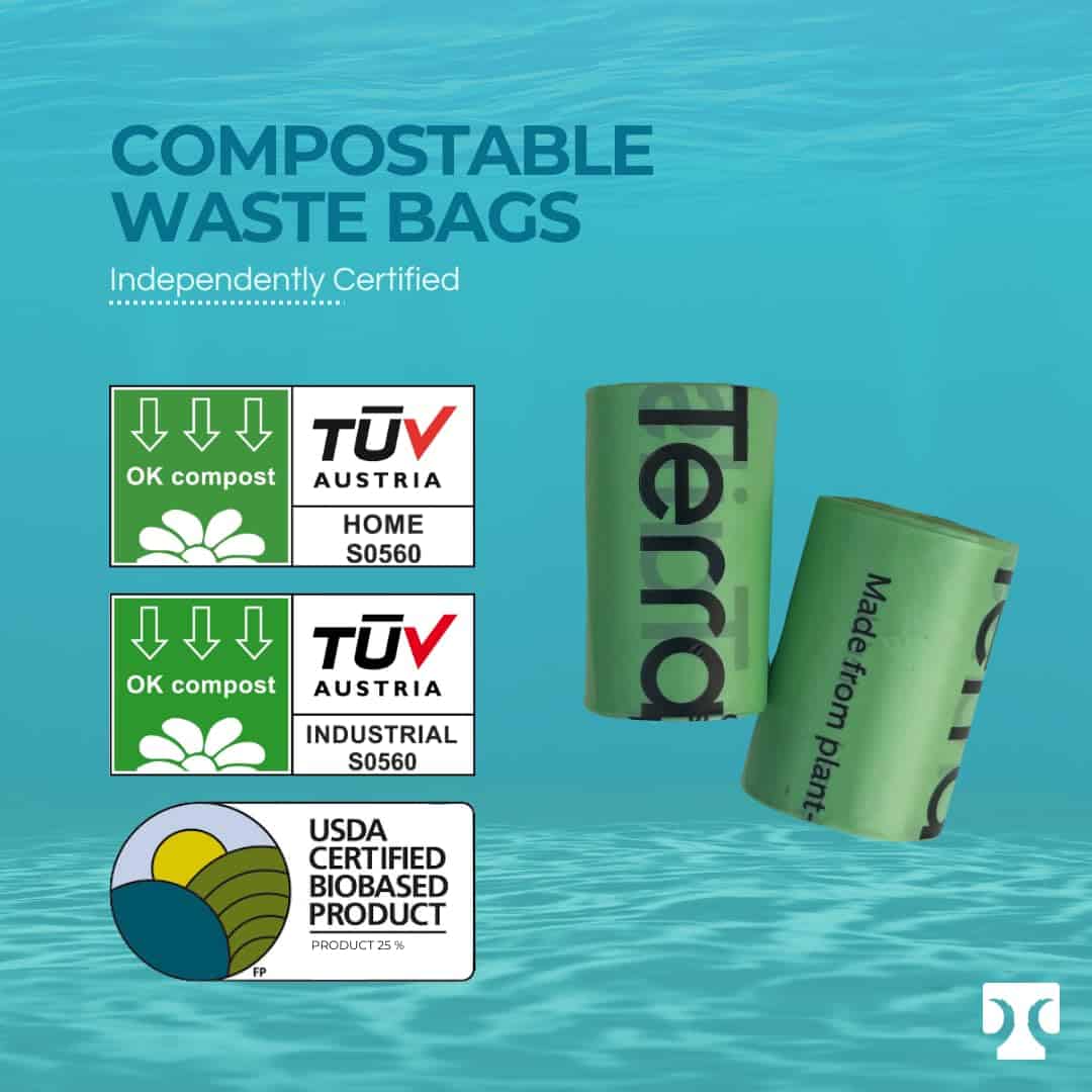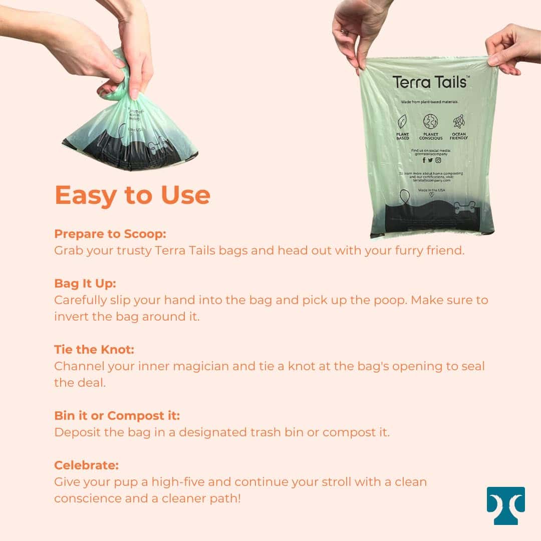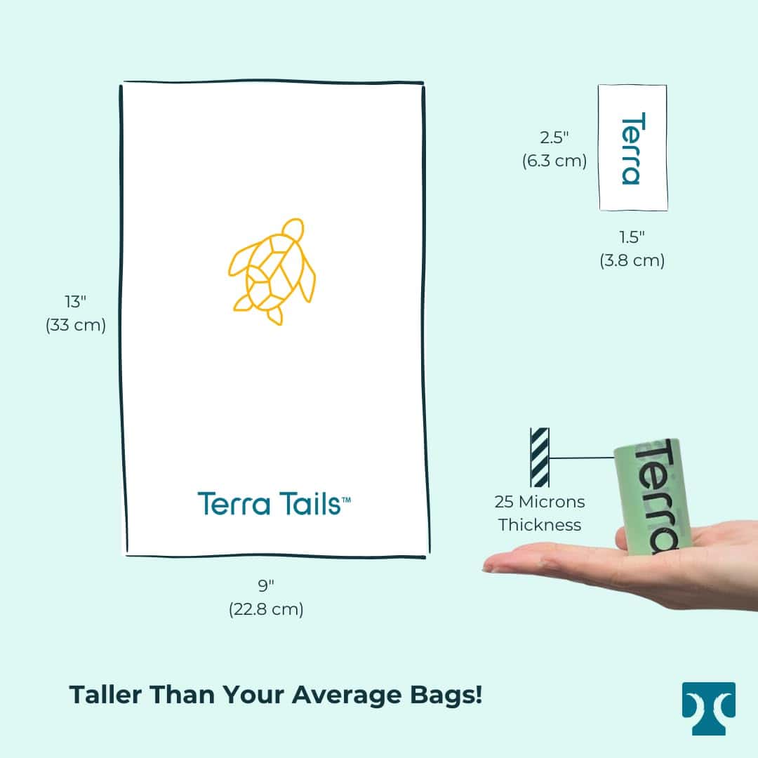 Hechas con almidón de maíz y aceite vegetal, e impresas con tinta a base de agua, estas bolsas de desechos para perros sin aroma son Certificadas para el Compostaje en Casa. Son más grandes y más gruesas que la bolsa de desechos plástica estándar, garantizando una limpieza sin desorden. Porque cuando se trata de tu compañero peludo, ¿por qué conformarse con algo menos que un viaje majestuoso y ecológico que sea tan maravilloso como la compañía de tu perro mismo? ¡Únete a nosotros en nuestra misión de redefinir las soluciones de desechos para mascotas, una bolsa de popó compostable a la vez. Elige Terra Tails y haz la diferencia hoy! Empresa Pequeña Operada por Mujeres.