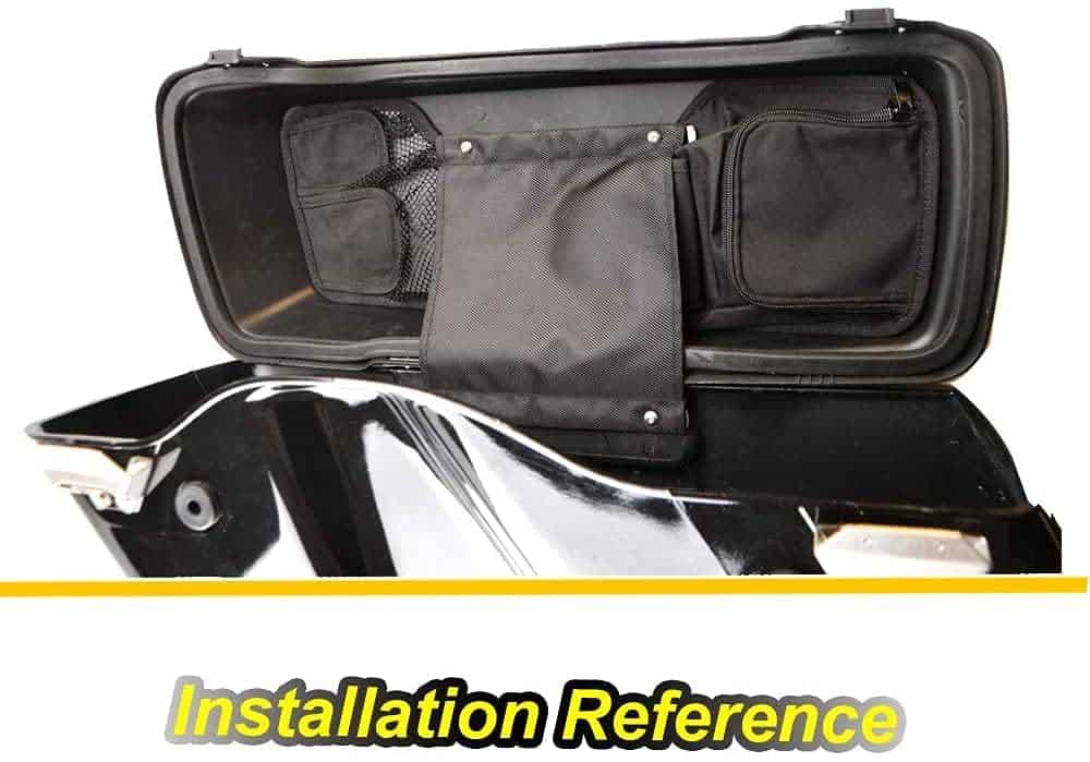 Compatible con 1999-2013 Harley Davidson Touring Road King, Electra Glide, Street Glide y Road Glide con Hard Saddlebags y Tour Pack. Negro y ribete, funcional y de estilo inteligente, material impermeable y duradero para un largo tiempo de servicio. Diseñado para maximizar tu espacio de carga con los diversos bolsillos separados cuando viajas. La instalación se puede completar en minutos sin necesidad de modificar tu motocicleta. Se instala fácilmente en las tapas de las alforjas y en el tour pack con tiras de cierre de gancho y bucle incluidas en los puntos de fijación de la fábrica.