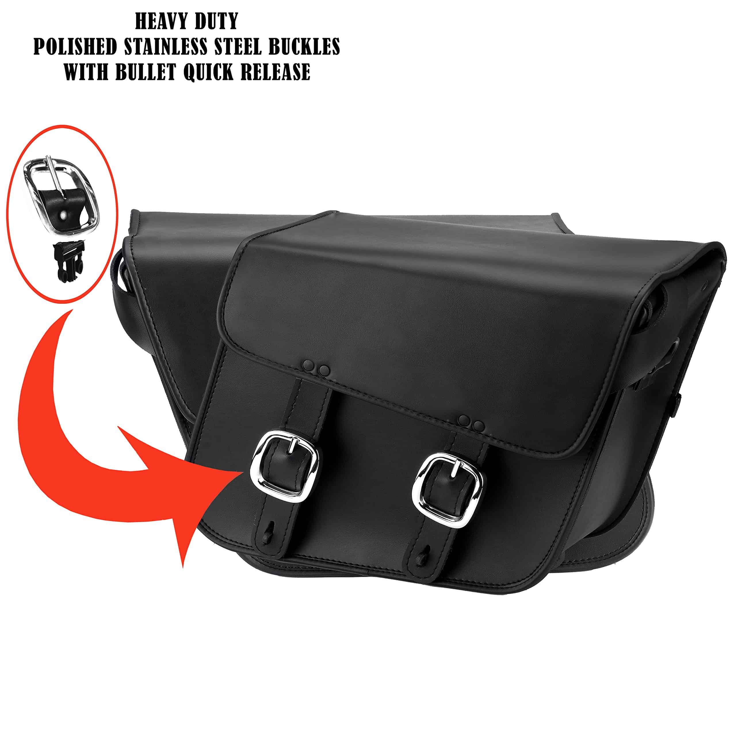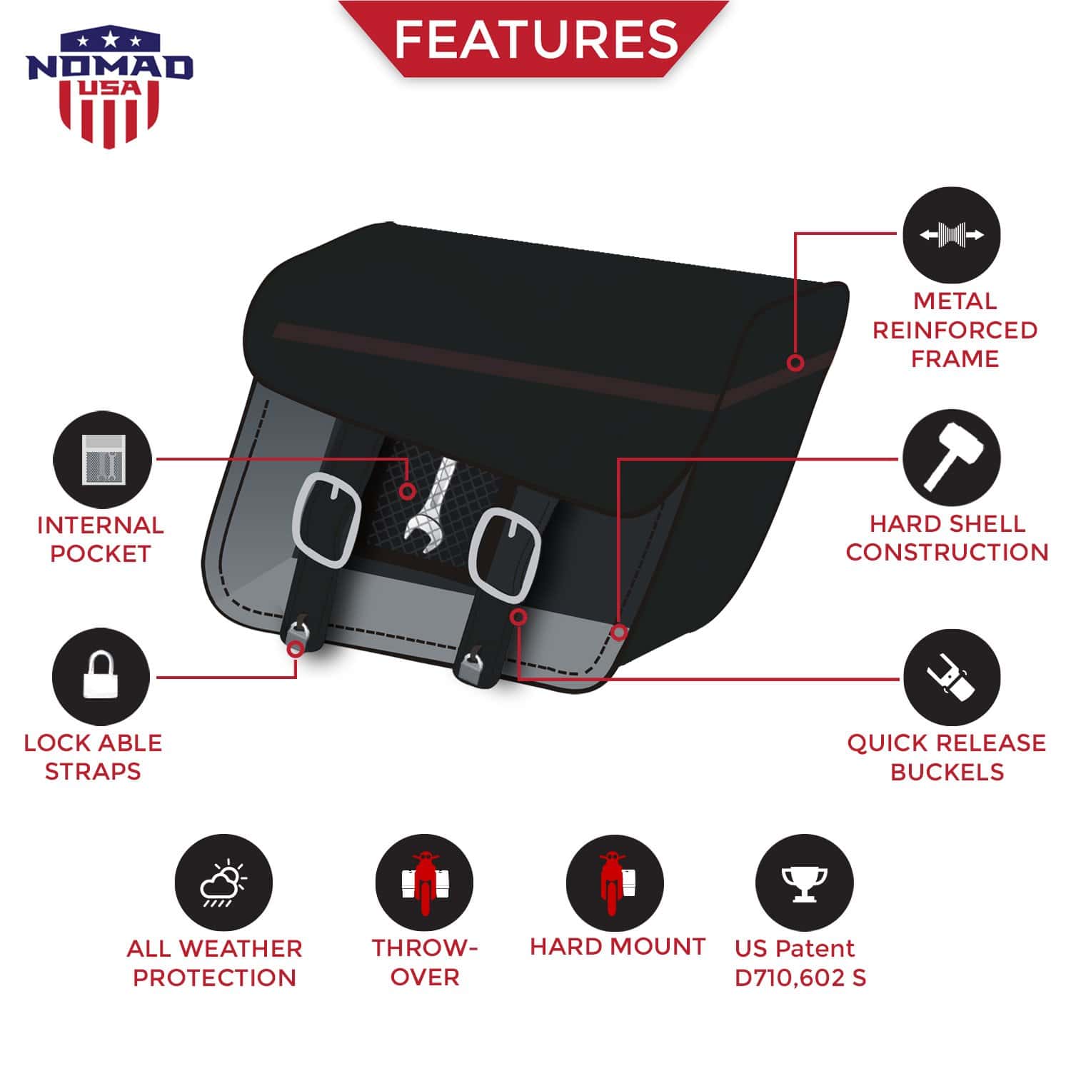 Todas las Bolsas de Sillín para Motocicleta de Nomad USA están hechas de cuero sintético 100% impermeable y duradero que hace que estas bolsas sean seguras contra los elementos climáticos adversos. Las líneas limpias y el estilo inclinado sin desorden de las alforjas complementan el aspecto y el diseño de tu moto. Estas alforjas son muy seguras y convenientes de abrir. Precios extremadamente asequibles tanto para bolsas derechas como izquierdas. Las hebillas de liberación rápida te ayudan a ahorrar tiempo al proporcionar un acceso rápido a tus artículos. Nomad USA ofrece maletas de alta calidad para motocicletas y alforjas de cuero para motocicletas. Cada alforja para motocicletas tiene un cuerpo duro reforzado con una estructura de metal que garantiza una alta retención de forma durante largos períodos de tiempo.