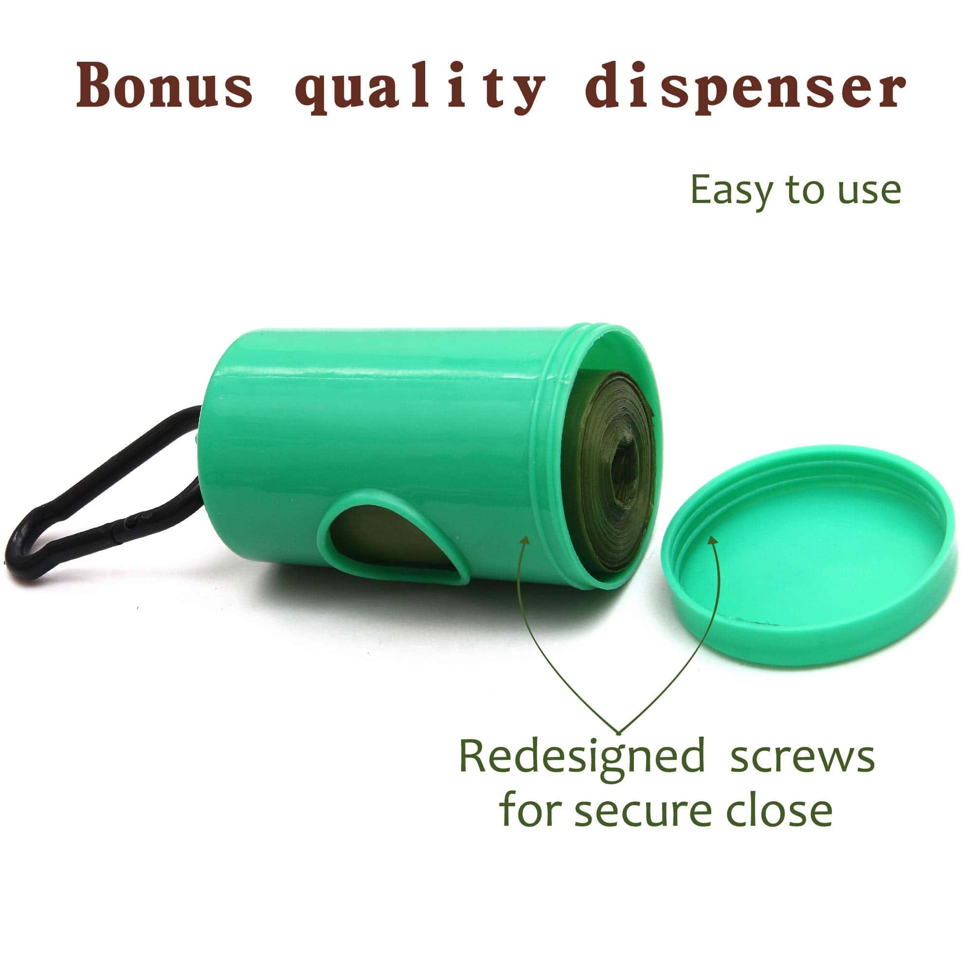 4. DISPENSADOR DE BOLSAS RESISTENTE INCLUIDO – Nuestro soporte de bolsas para excremento de perro de calidad está diseñado pensativamente y dimensionado para adaptarse a todos los rollos de recambio estándar para bolsas para excremento; Recargue convenientemente un rollo y asegúrelo con una tapa que se enrosca en poco tiempo; Mosquetón para enganchar el dispensador en una correa.