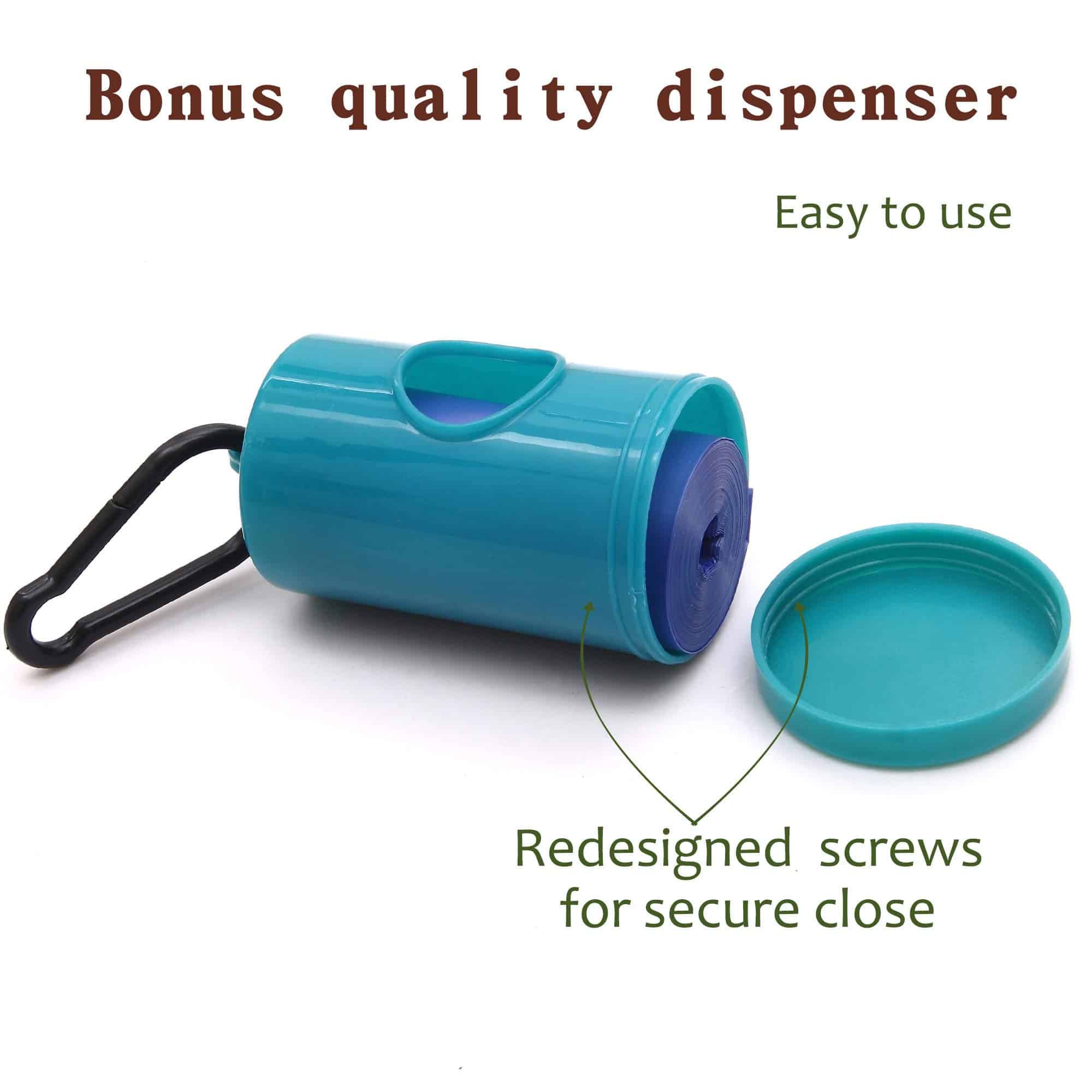 4. DISPENSADOR DE BOLSA RESISTENTE INCLUIDO – Nuestro soporte de bolsa de desechos de perro de calidad está pensado y dimensionado para adaptarse a todos los rollos de recambio de bolsas para desechos; Recargue convenientemente un rollo y fíjelo con una tapa que se enrosca en poco tiempo; Mosquetón para sujetar el dispensador a una correa.