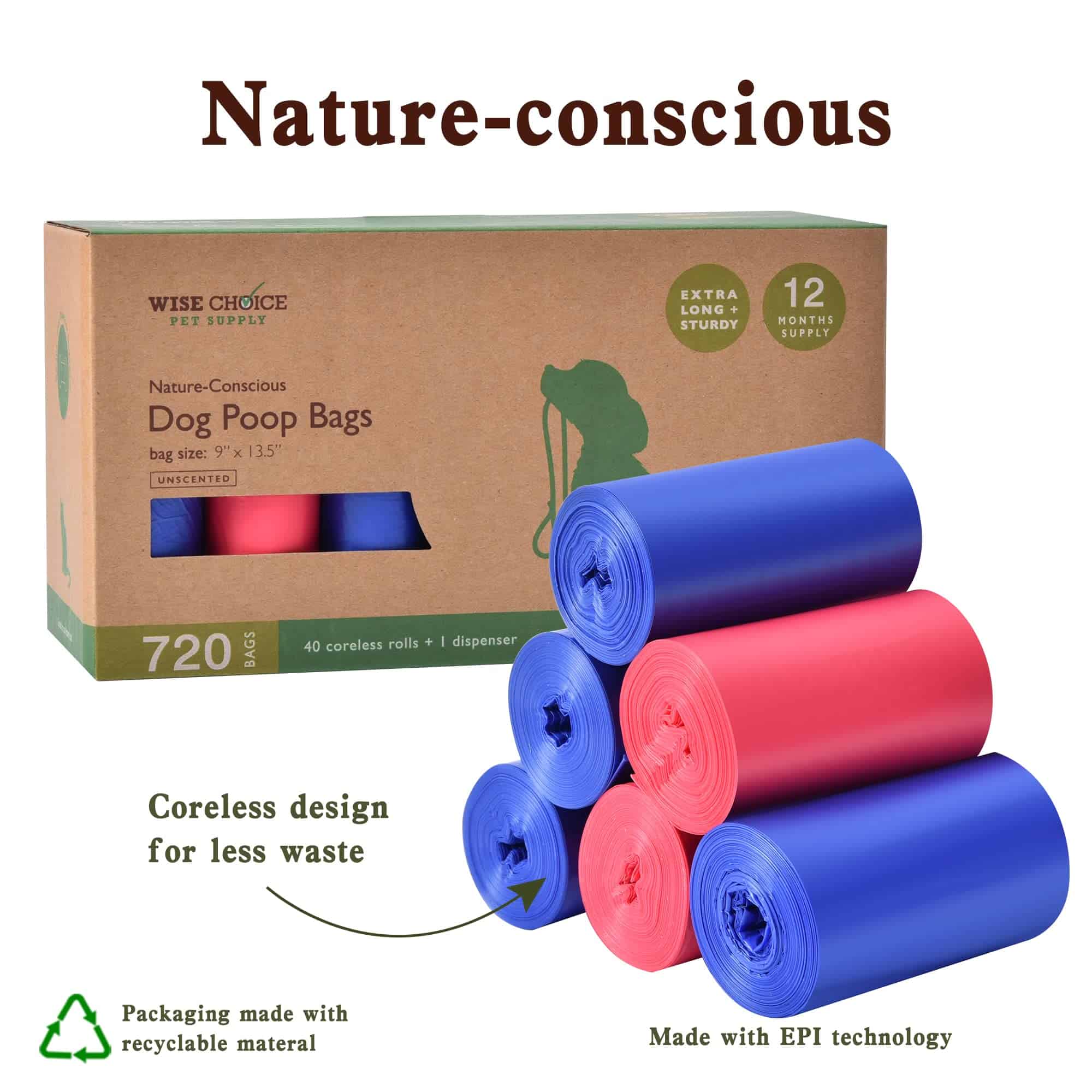 Las bolsas para recoger excrementos de perro Wise Choice Pet Supply son bolsas de desechos fuertes y extra grandes diseñadas para padres de mascotas conscientes para ofrecer una solución probada que sea respetuosa con el medio ambiente y garantice un manejo sanitario del 100%. El paquete a granel de bolsas para recoger desechos de perro, convenientemente empaquetado en una caja compacta, incluye 720 bolsas para desechos de mascotas sin fragancia en 40 rollos de recambio sin núcleo y 18 bolsas por rollo, con un dispensador resistente GRATIS y un clip para correa. ¡Rollos coloridos en turquesa, naranja, azul, verde y rosa para hacer que recoger sea más divertido!Las bolsas para desechos de mascotas Wise Choice son bolsas de desechos extra grandes para perros, más grandes que las bolsas de desechos estándar, de 13.5×9 pulgadas, brindando suficiente espacio para atar un nudo en la parte superior para minimizar el olor y proteger bien las manos. Estas bolsas de desechos gruesas y resistentes son 100% a prueba de fugas, un ayuda excepcional para cualquier dueño de mascota o paseador de perros profesional para recoger caca de mascotas, no solo es bueno para cachorros pequeños a perros grandes, también para limpiar la caja de arena para gatos.Nuestras bolsas de eliminación de desechos de mascotas son resistentes sin comprometer la comodidad. Nuestro dispensador de bolsas es fácil de abrir y cerrar de forma segura, y el clip para correa es discreto para attach a tu correa o cinturón para un fácil acceso. La perforación clara hace que cada bolsa para perros se separe sin esfuerzo del rollo y sea fácil de abrir. La pegatina que sostiene un rollo es fácil de quitar sin rasgar la primera bolsa. En conjunto, estás bien preparado para disfrutar de recogidas diarias sin estrés ya sea en tu patio trasero o paseos sobre la marcha!Wise Choice Pet Supply tiene un fuerte enfoque en ser consciente de la naturaleza. Las bolsas para recoger excrementos de perro Wise Choice Pet Supply están hechas con aditivos EPI para ayudar a que nuestras bolsas para perros se descompongan más rápido que la contaminación plástica regular. Nuestros rollos de bolsas para desechos de mascotas son sin núcleo y cada caja de embalaje está hecha de material reciclado, ya que estamos orgullosos de hacer algo pequeño pero consistente para dejar nuestra tierra con menos desperdicios.
