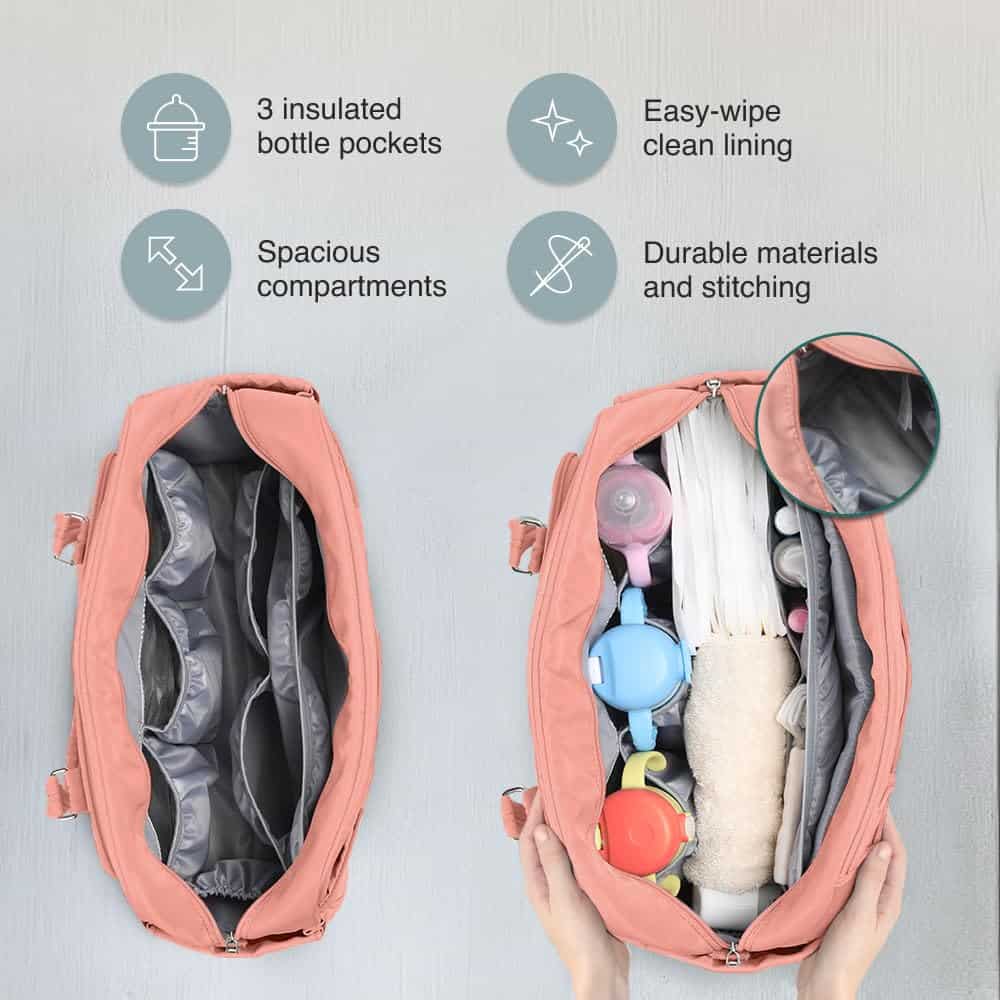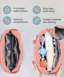 1. Espacioso y bien construido – 1 compartimento principal y 14 bolsillos funcionales, así como 3 bolsillos aislados aseguran que tus esenciales se mantengan organizados sin tener que rebuscar. Esta amplia bolsa cambiador puede ser llenada con todos los elementos esenciales para el bebé. Desde la ropa de bebé hasta los bocadillos, todo se puede mantener en orden y de fácil acceso, incluyendo un llavero para asegurarte de que tus llaves estén al alcance de tu mano.
