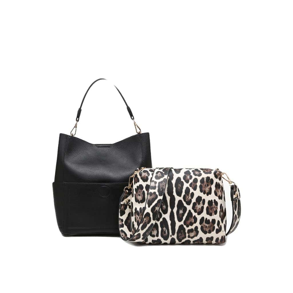 El Bolso Cubo JEN & CO. Abby 2 en 1 con Correa de Guitarra de Estampado Animal es una manera elegante de tener todos tus elementos esenciales al alcance de tu mano. Este estilo popular incluye un asa desmontable y una correa de guitarra removible que se puede unir tanto al bolso principal como al bolso interior. ¿Qué combinación de color/estampado elegirás? Cuenta con bolsillos laterales y frontales y herrajes en tono dorado. Hecho de cuero vegano.