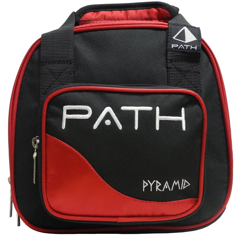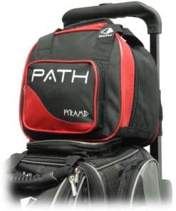 Bolso de bolos Pyramid Path Plus One Spare Tote en color negro y rojo. Añade una bola adicional a todas las maletas con ruedas, independientemente de la marca. Se acopla fácilmente con correa de velcro a los mangos telescópicos para mayor comodidad. Cuenta con un bolsillo frontal para un almacenamiento adicional. Fabricado con tejido resistente 600D, este bolso ofrece calidad y diseño de Pyramid para satisfacer tus necesidades de bolos.