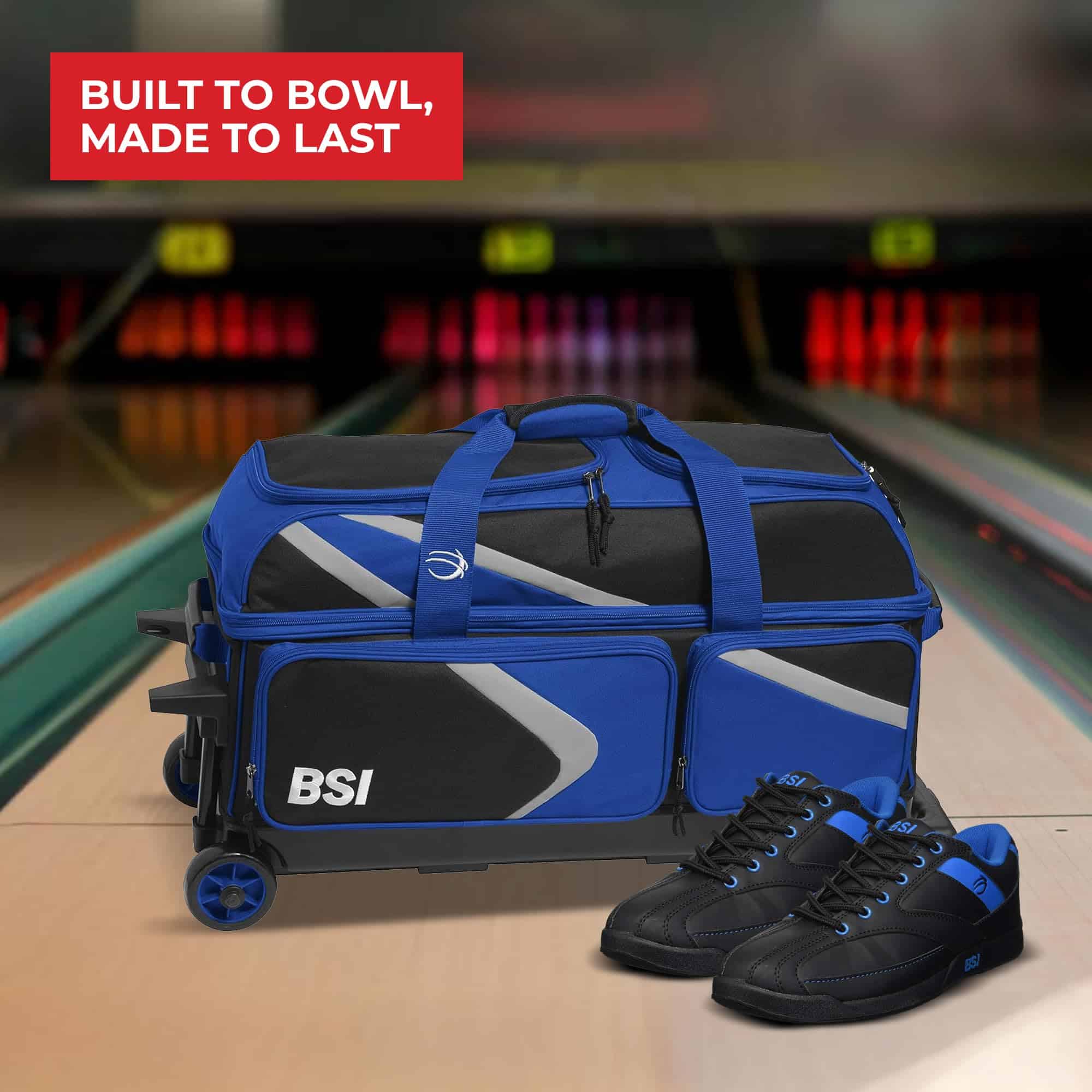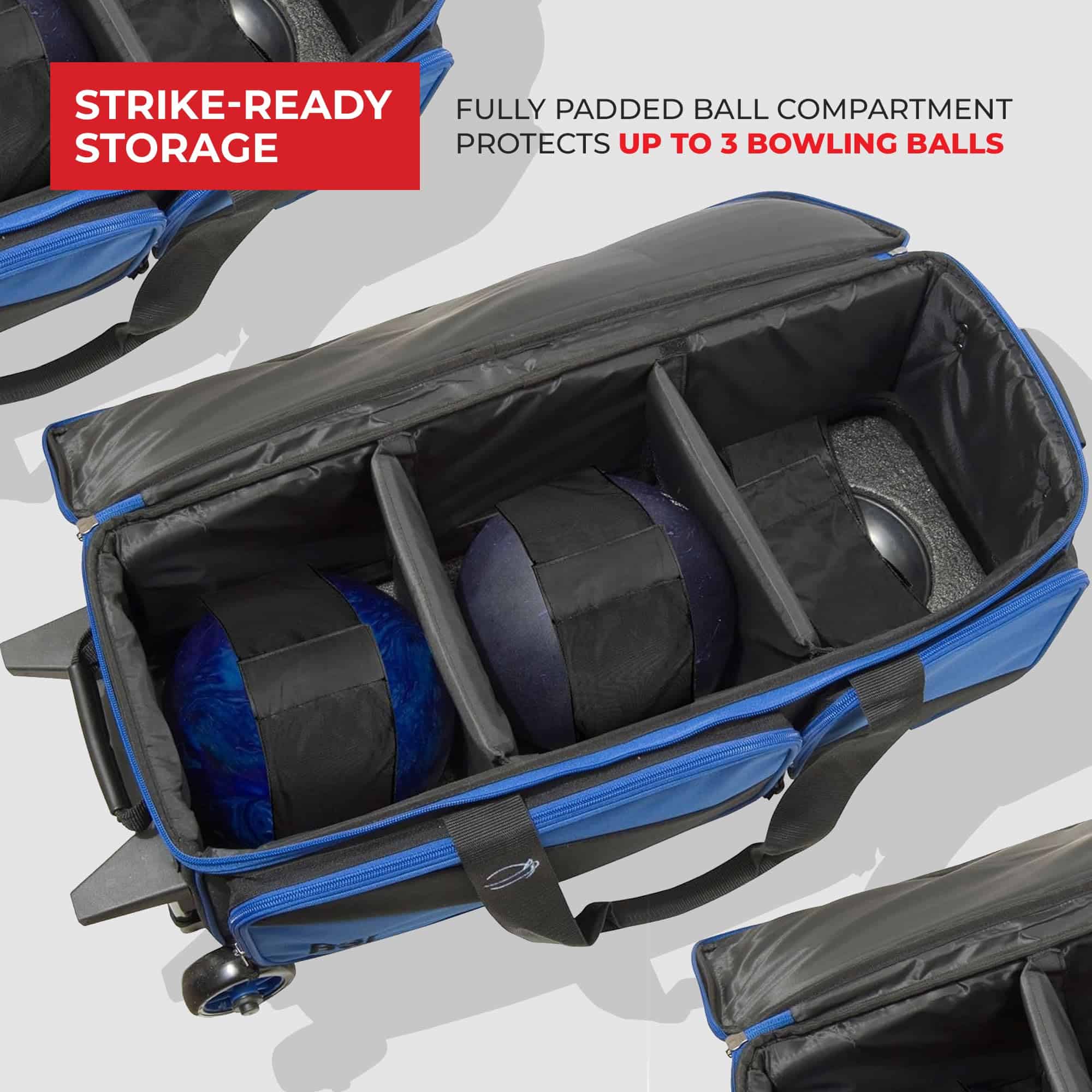 El bolso de Bowling BSI Dash Triple Roller es la forma perfecta de transportar tres bolas de bowling y al menos un par de zapatos a las pistas. Tiene correas de gancho y lazo para mantener las bolas de bowling en su lugar, un bolsillo organizador personal, un bolsillo para zapatos y mucho espacio adicional para cualquier accesorio, billetera y llaves.