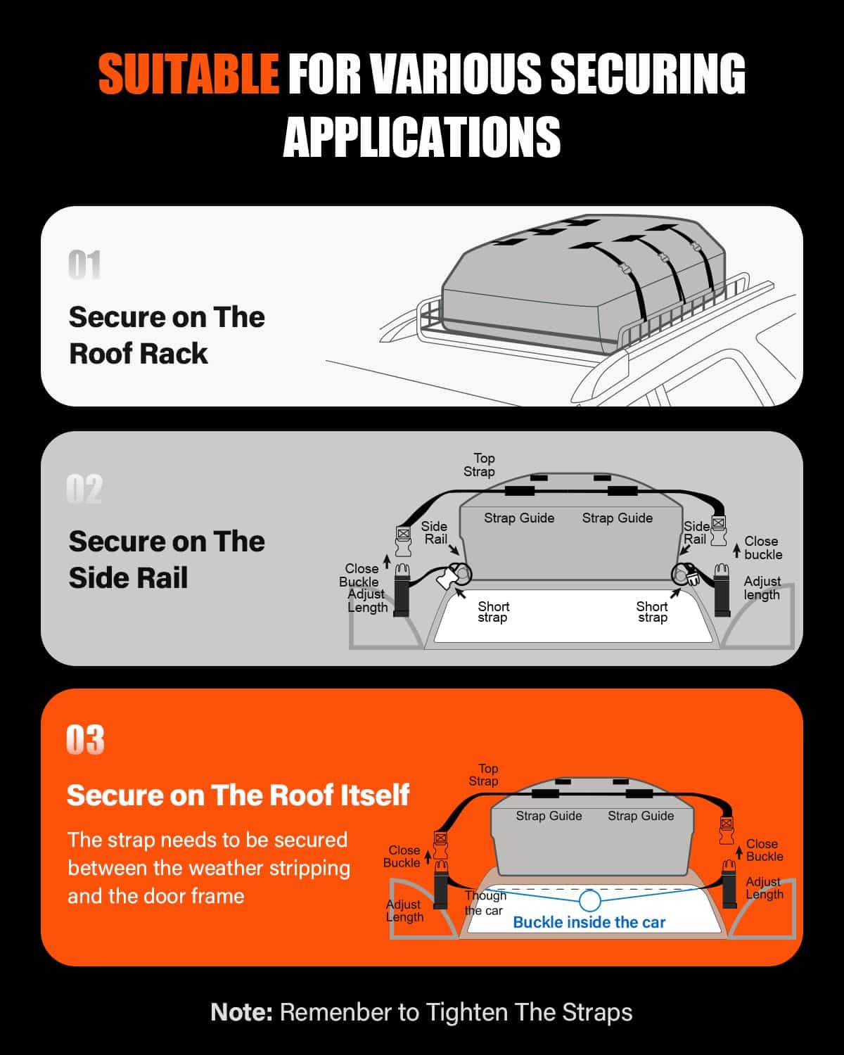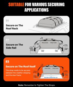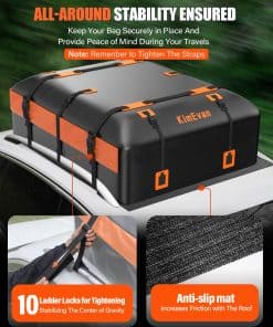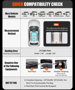 5. Compatibilidad Versátil: Nuestro bolso de techo Kimevan es compatible con una amplia gama de vehículos, incluidos autos y SUVs. Funciona igual de bien en autos equipados con bacas y en aquellos sin, ofreciendo un uso versátil que se adapta a tus necesidades.